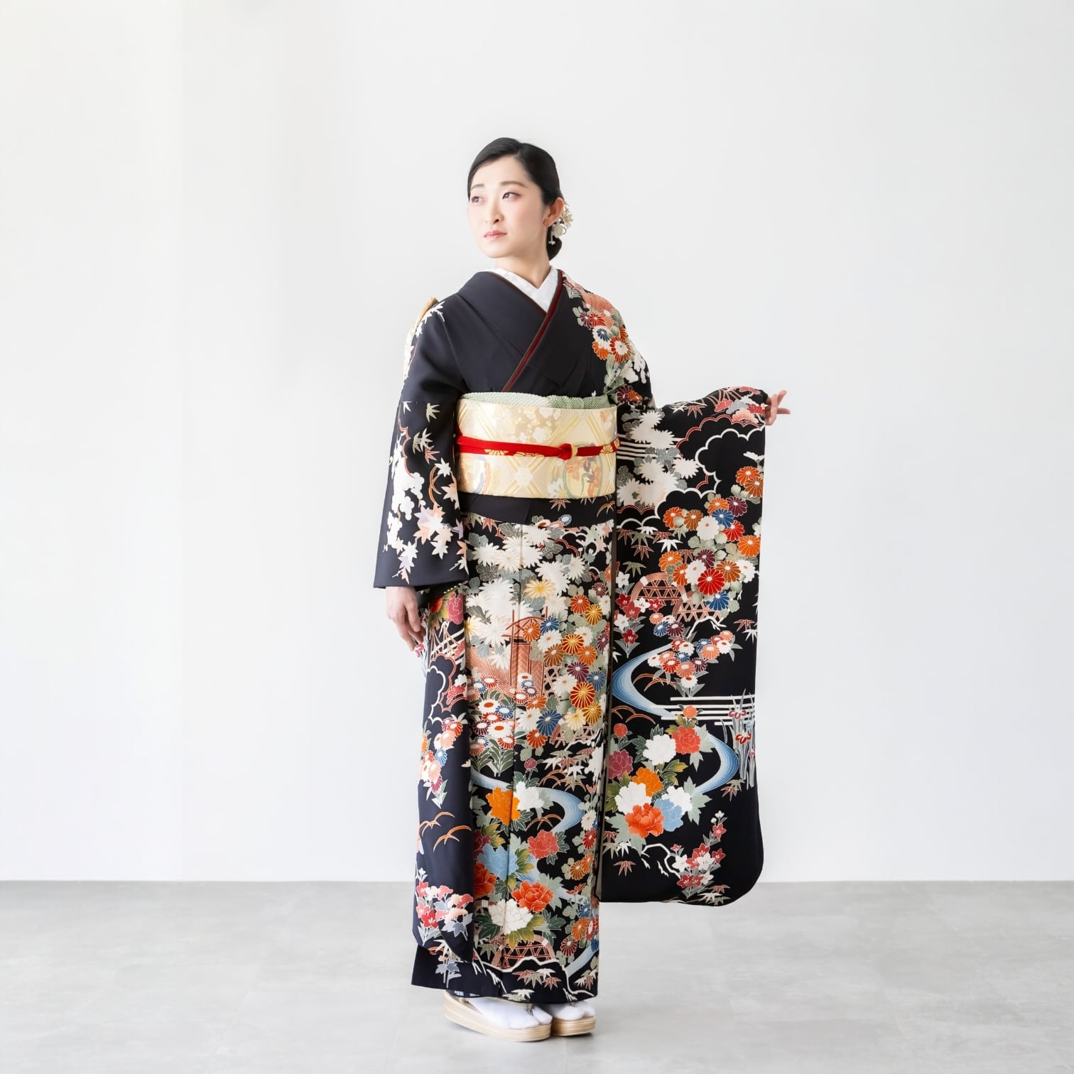 黒の地色に茶屋辻文様と四季の花々が華やかな振袖