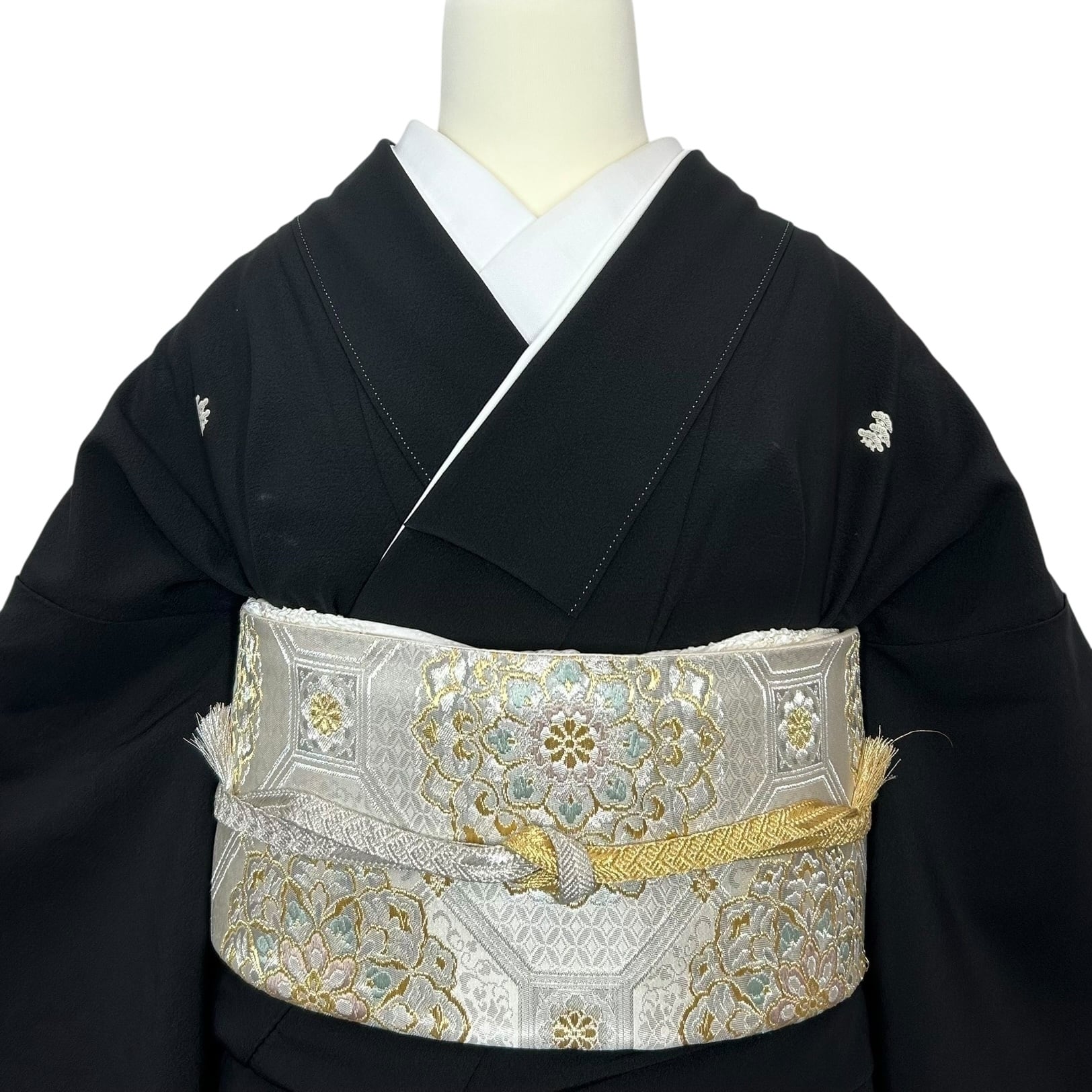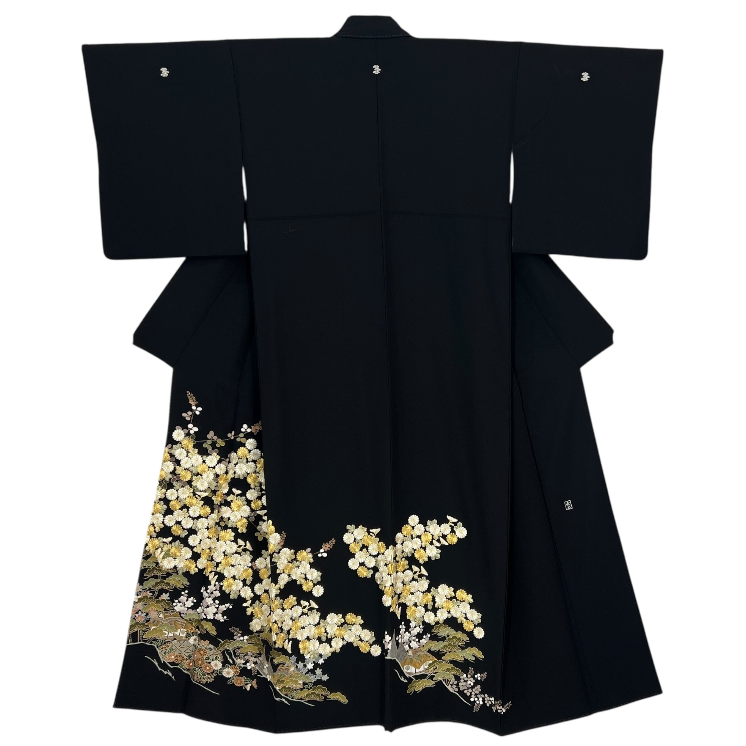 松竹梅など吉祥文様に菊花の刺繍が華やかな黒留袖 お喜びのお席に花を添える上品な黒留袖です。 着物着用シーン:結婚式・披露宴・パーティーなど 身丈:159.5cm 裄丈:65cm(身巾:32.5cm・袖巾:32.5cm) 袖丈:48.5m 後巾:30.5cm 前巾:23.5cm 参考サイズ:M ◆身長159.5cm位まで ◆ヒップ99.5cm位まで 仕立て:袷