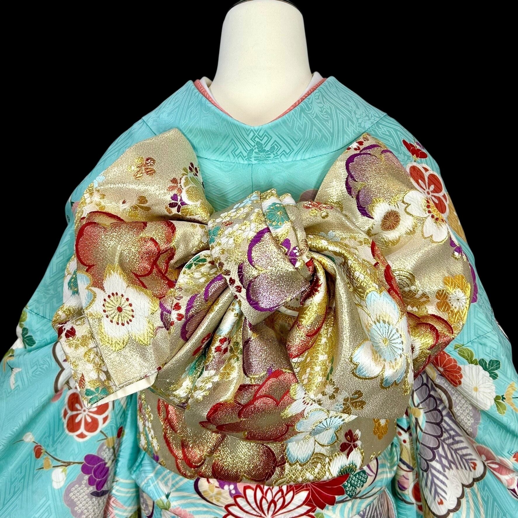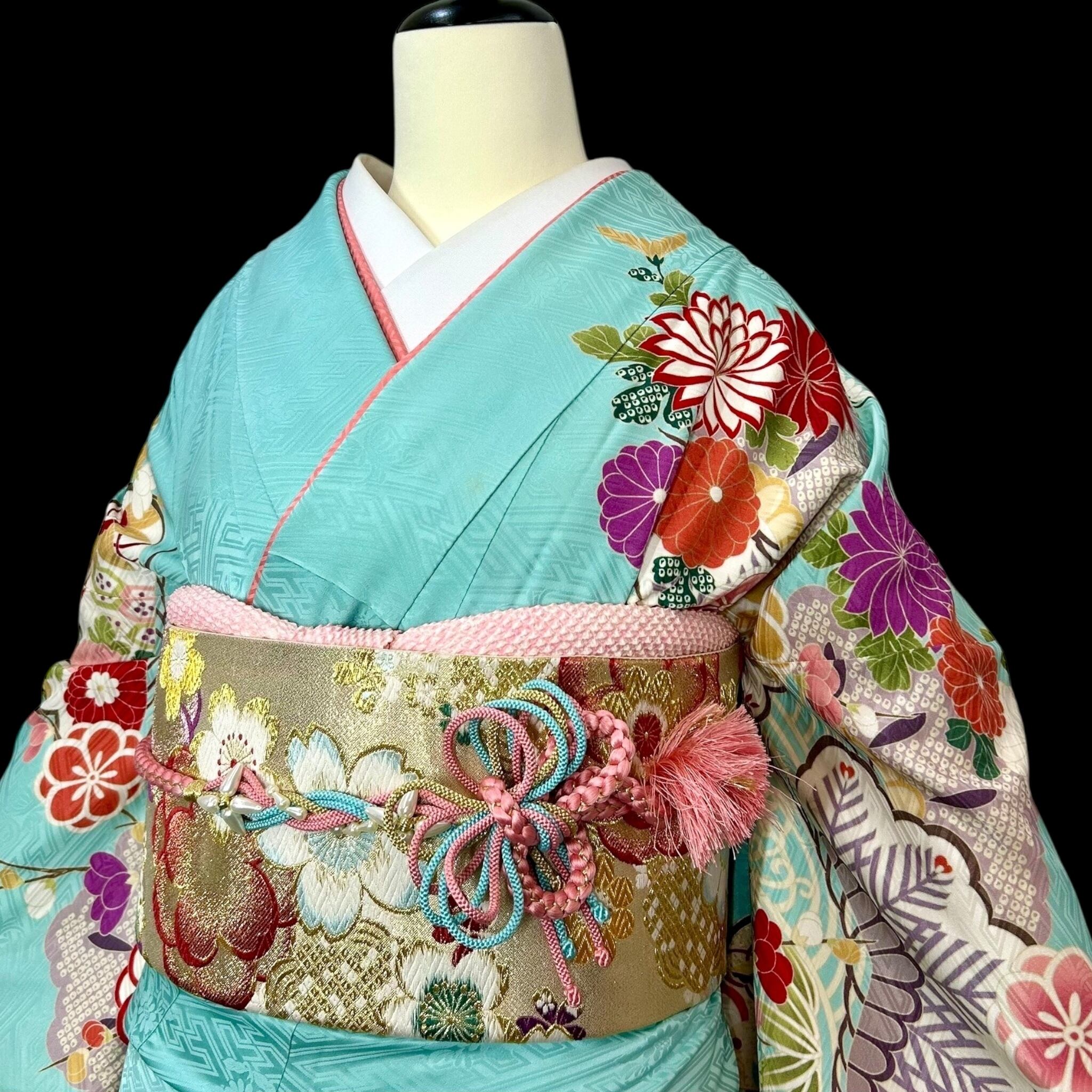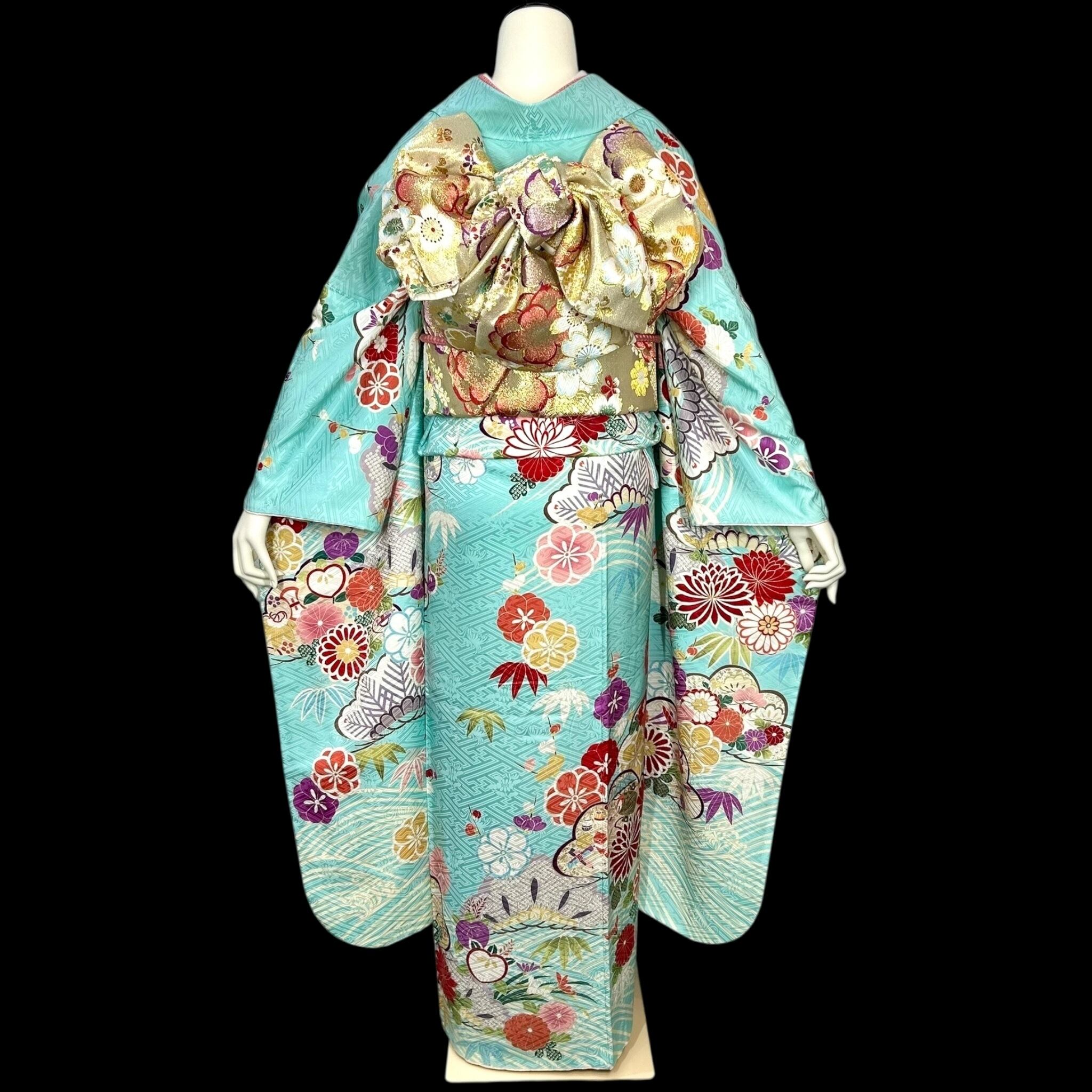 鮮やかな水色の地色に吉祥文様や大輪の四季草花が大胆に描かれた華やかな振袖