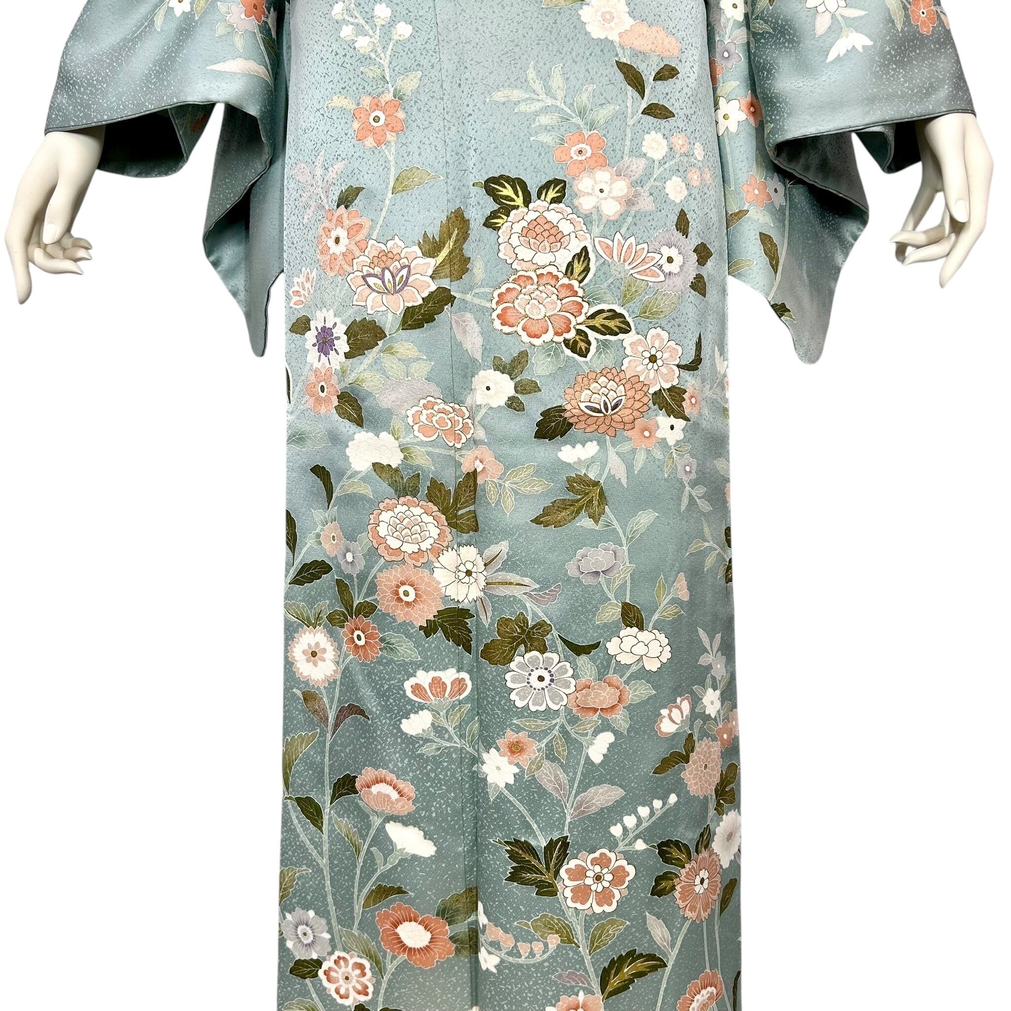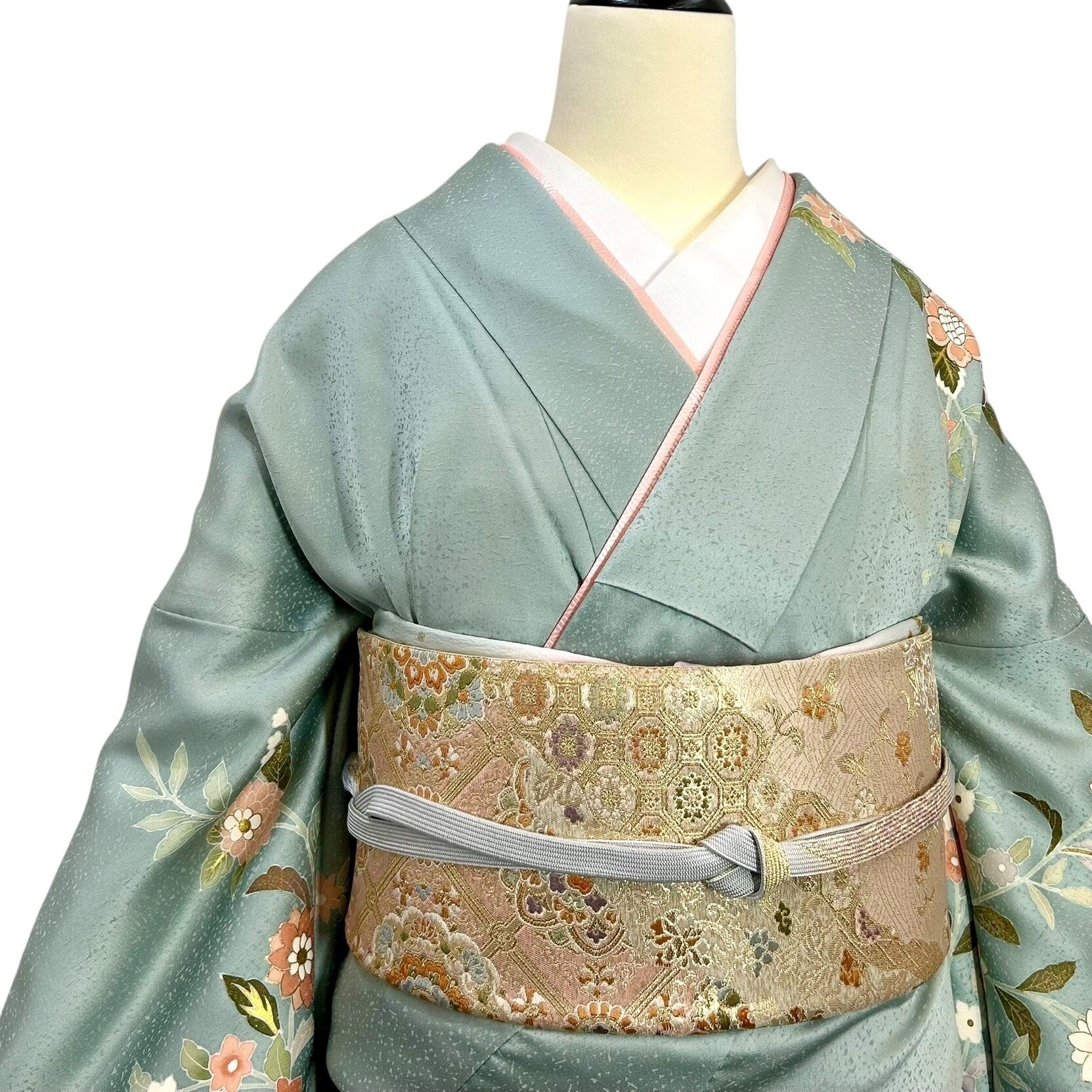 光沢のあるブルーグリーンの地色に枝花文様が華やかな訪問着です