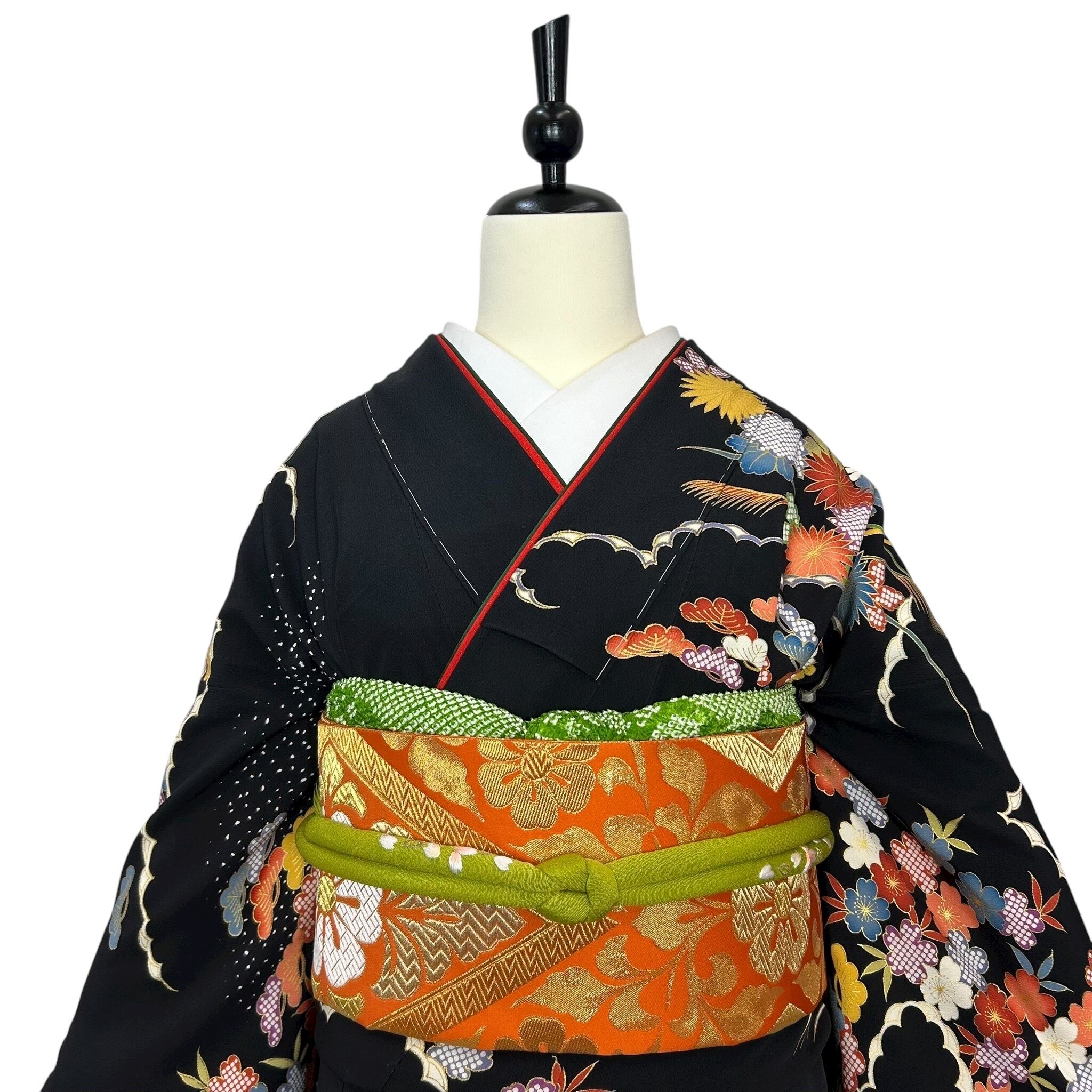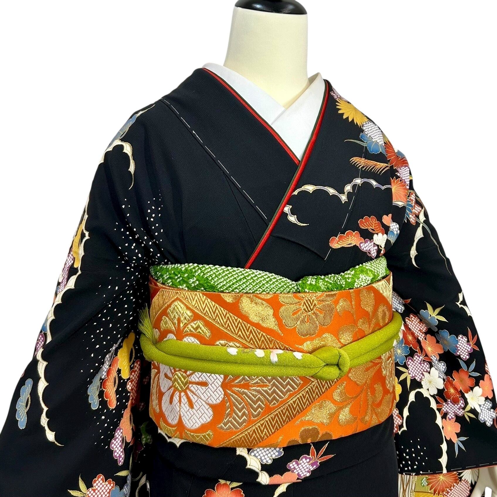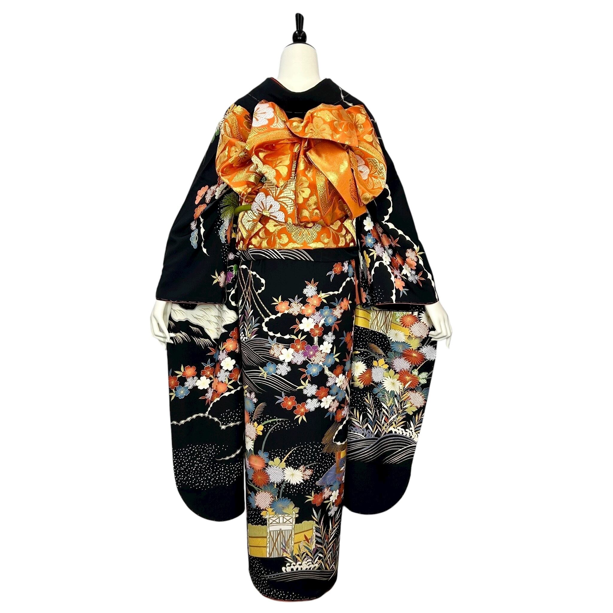 黒の地色に御所車や流水波文四季草花などが描かれた華やかな振袖