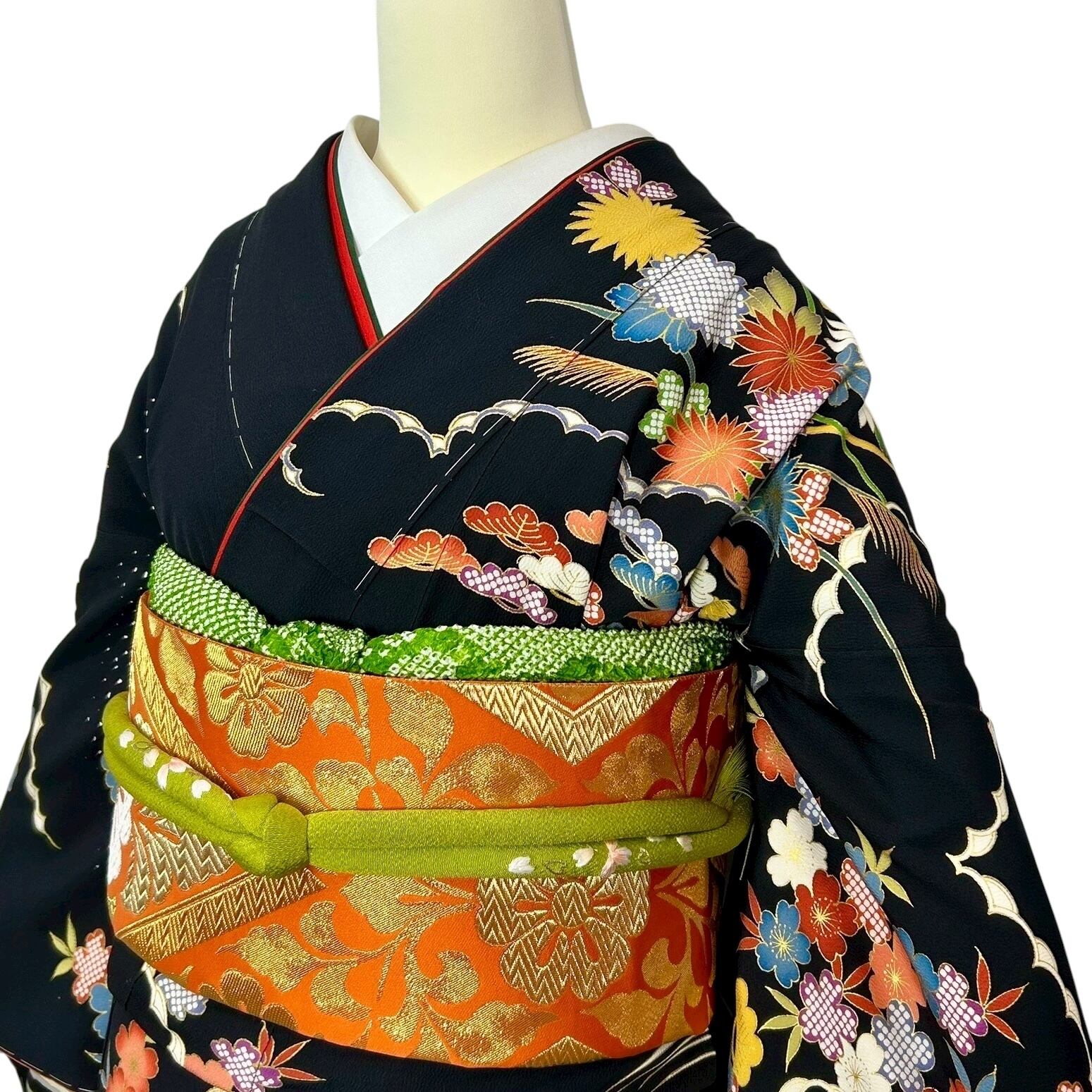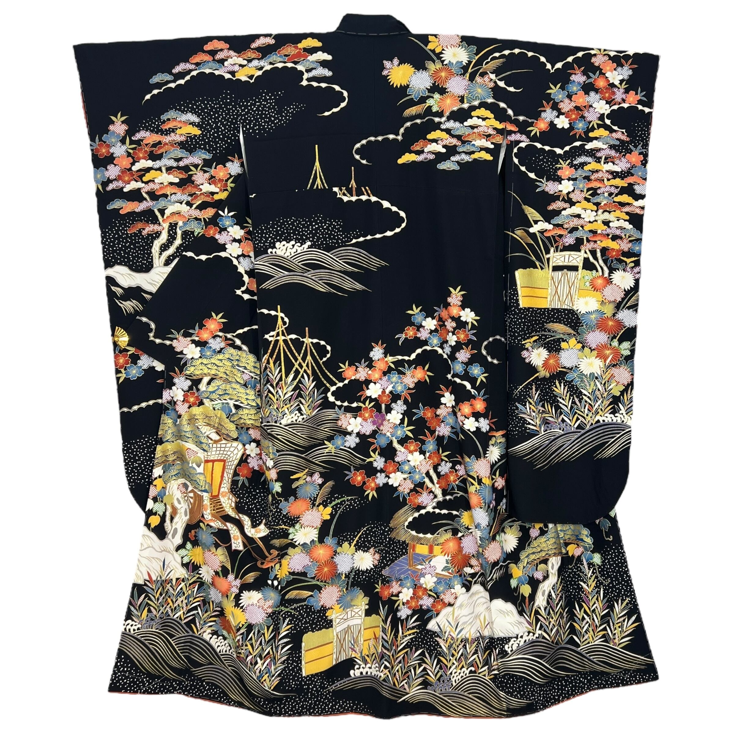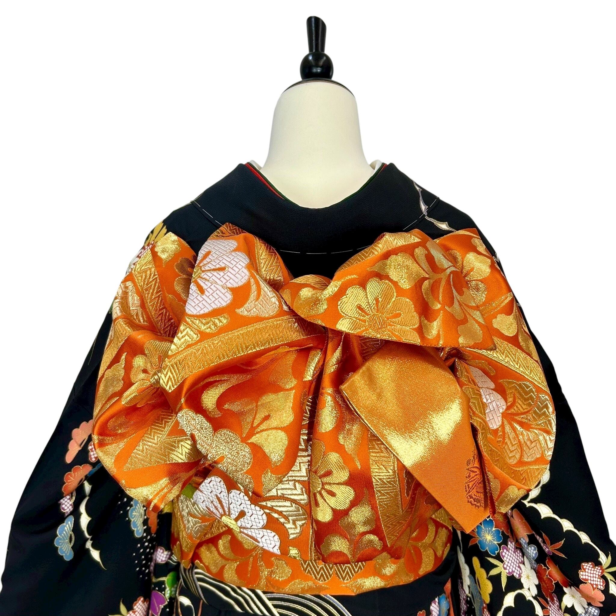 黒の地色に御所車や流水波文四季草花などが描かれた華やかな振袖