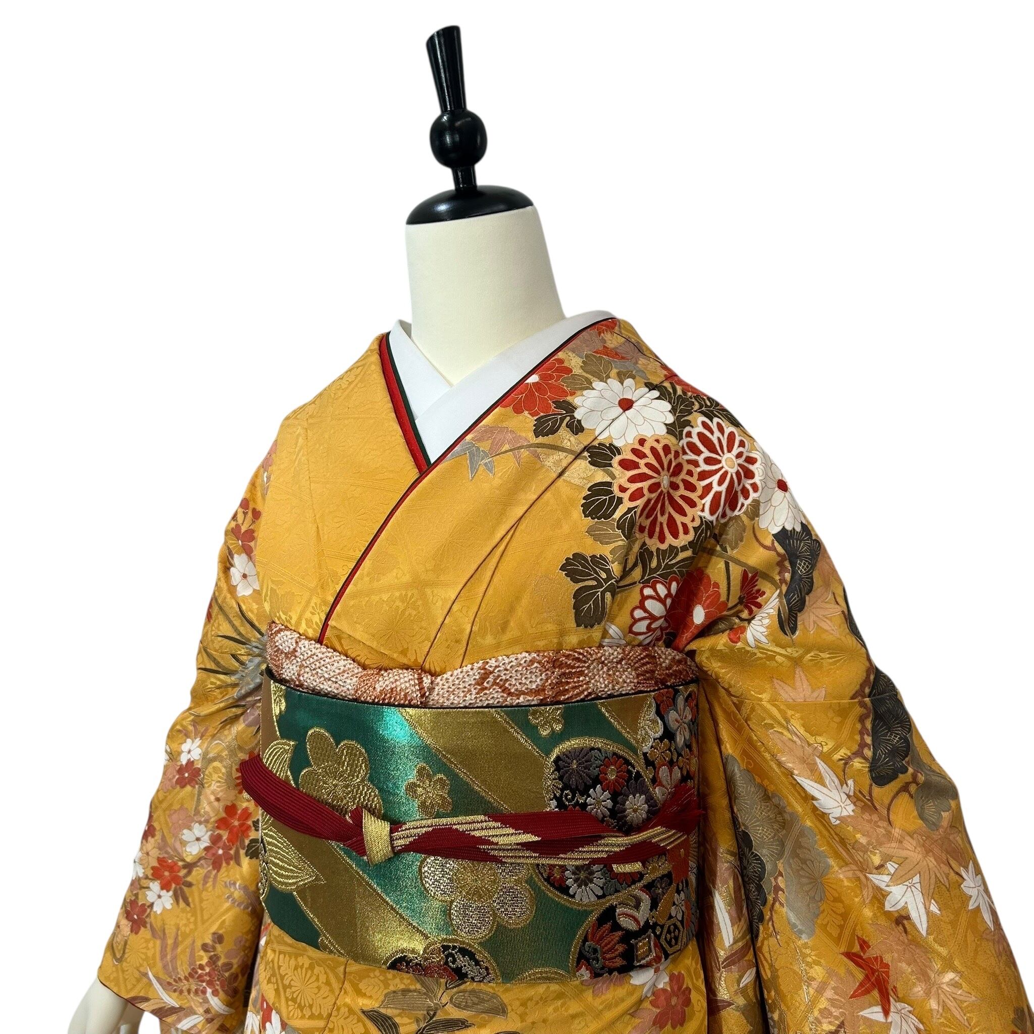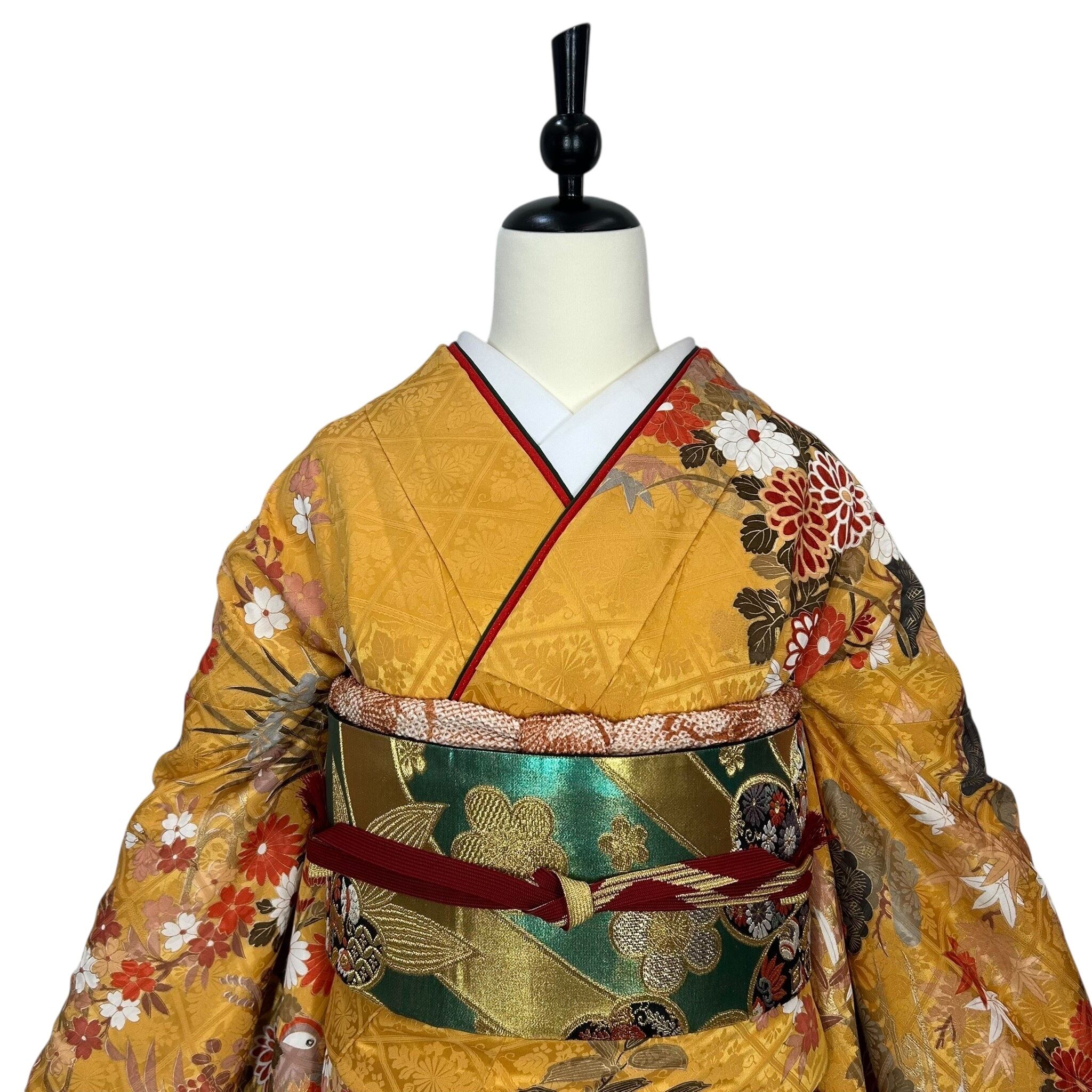 落ち着いた黄色の地色に流水や鴛鴦に四季草花を描いた華やかな振袖