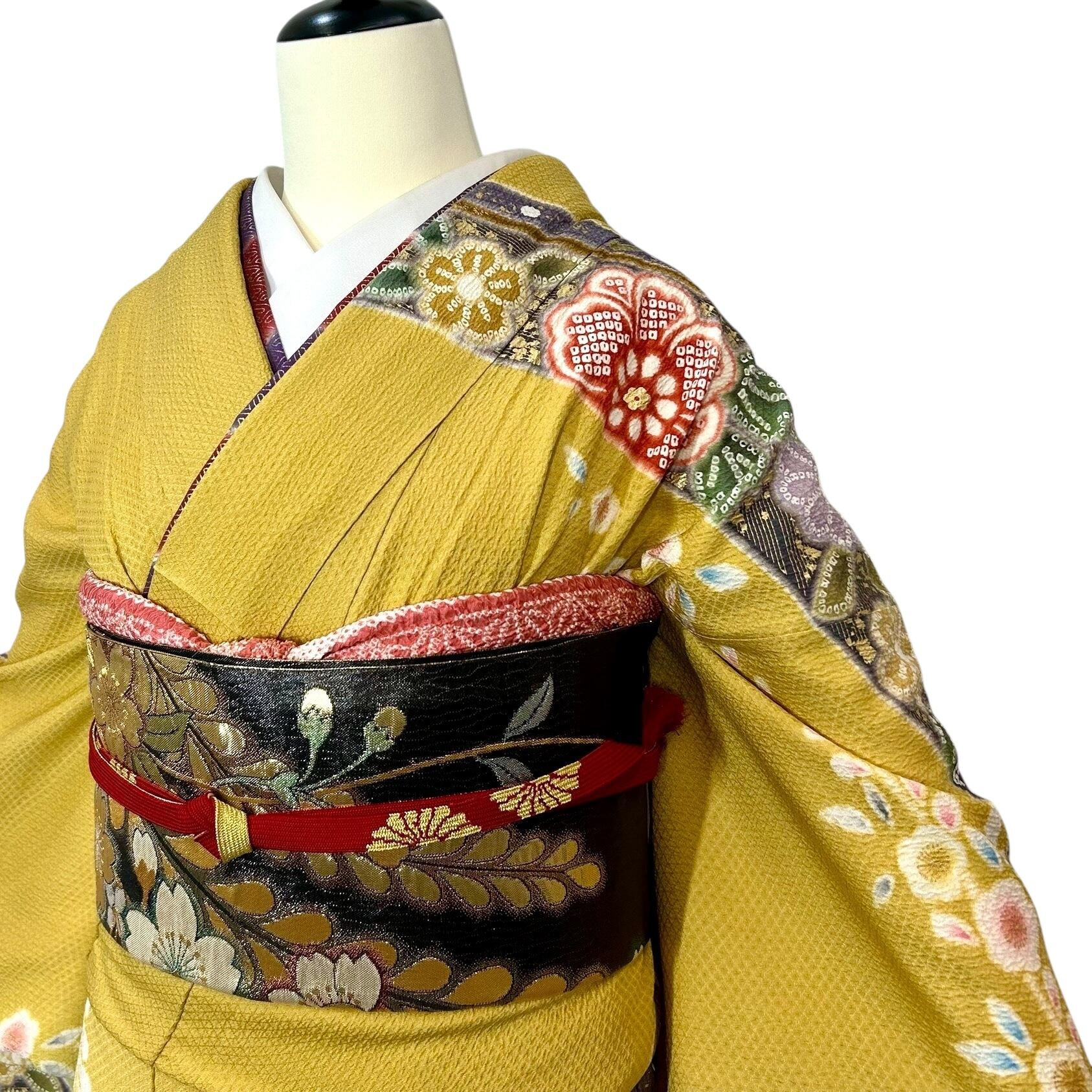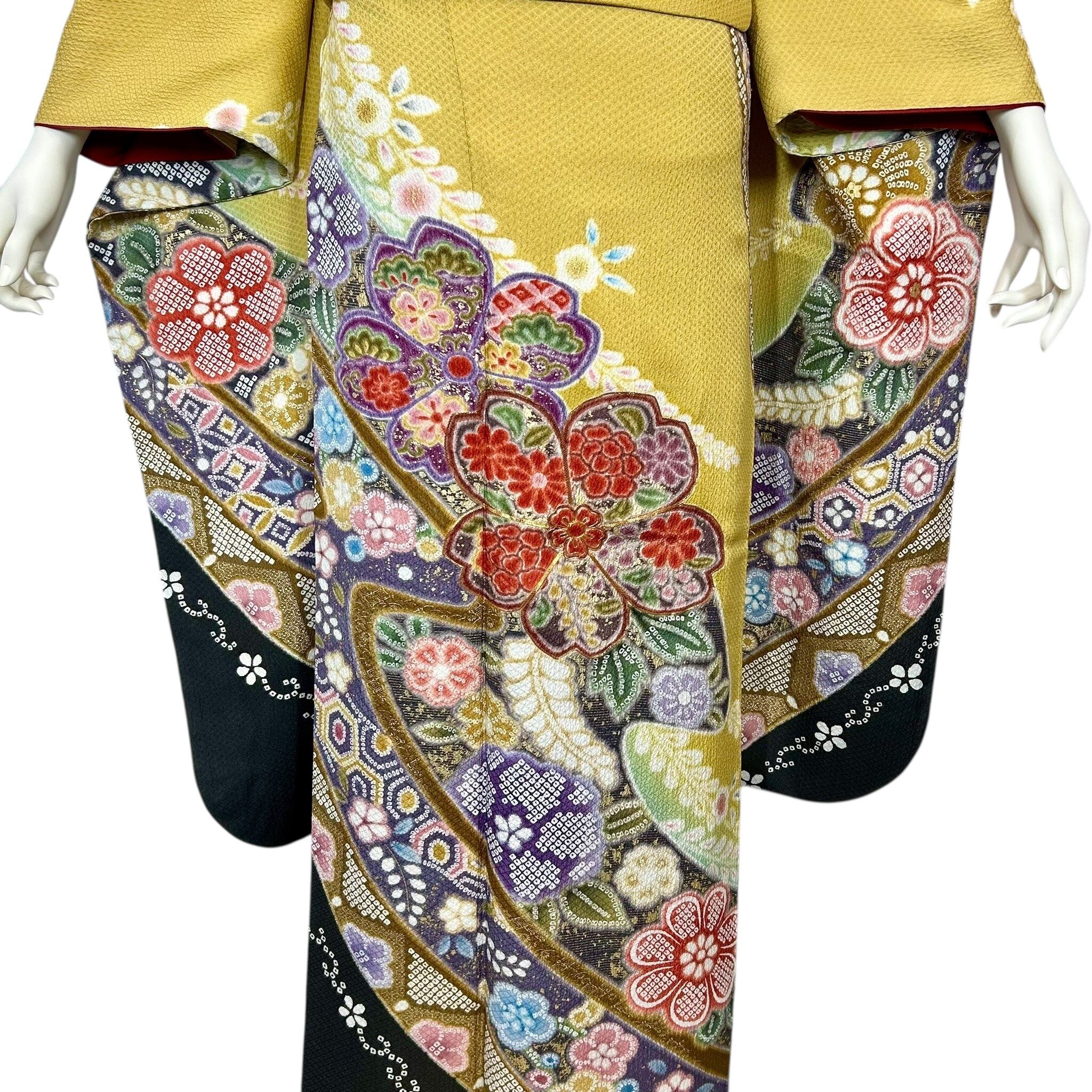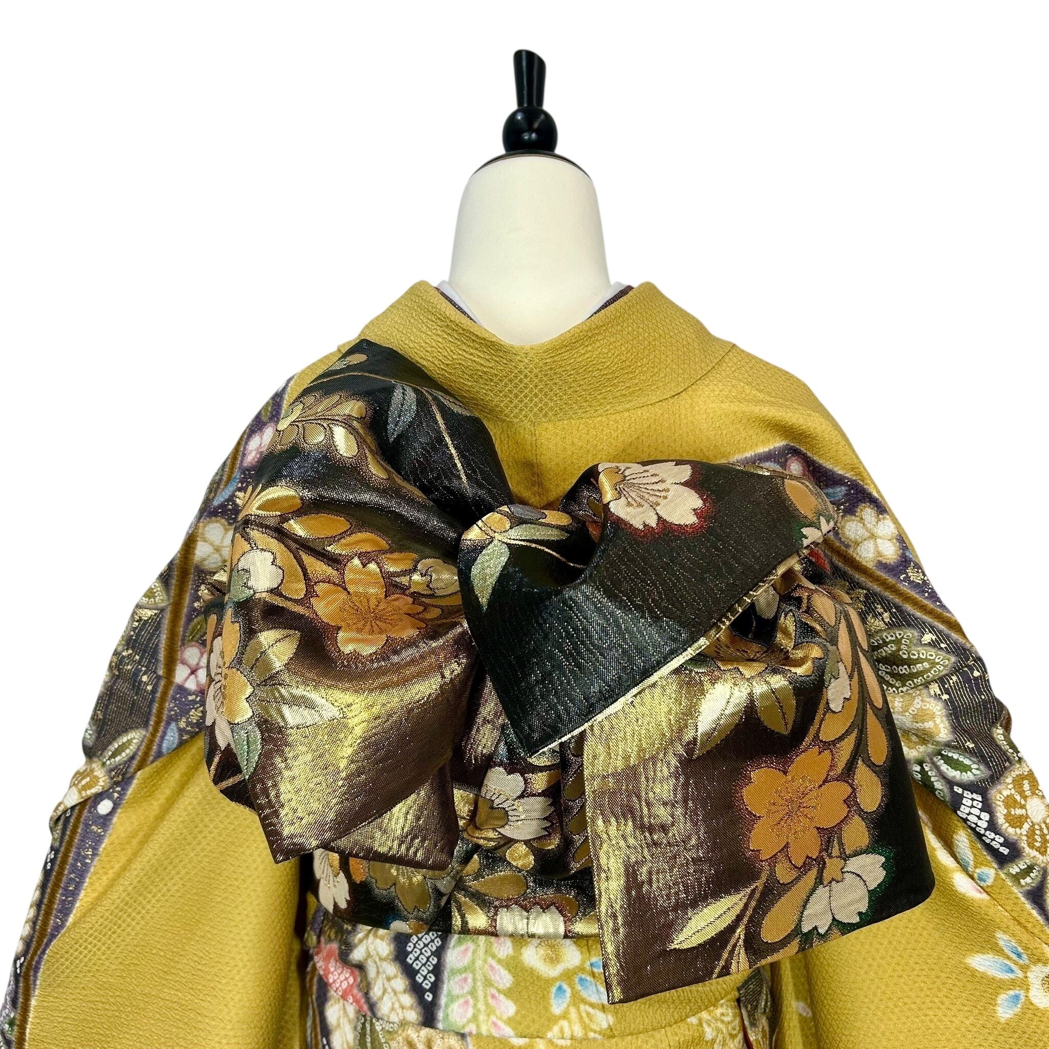 鮮やかな黄色の地色に疋田の熨斗目文様が華やかな振袖