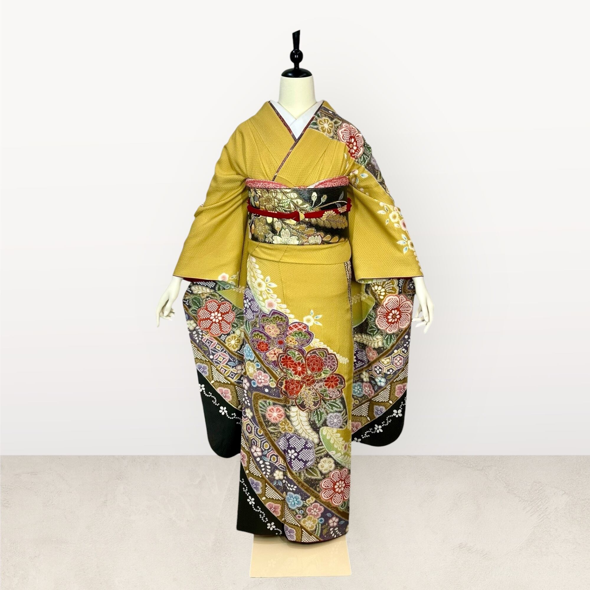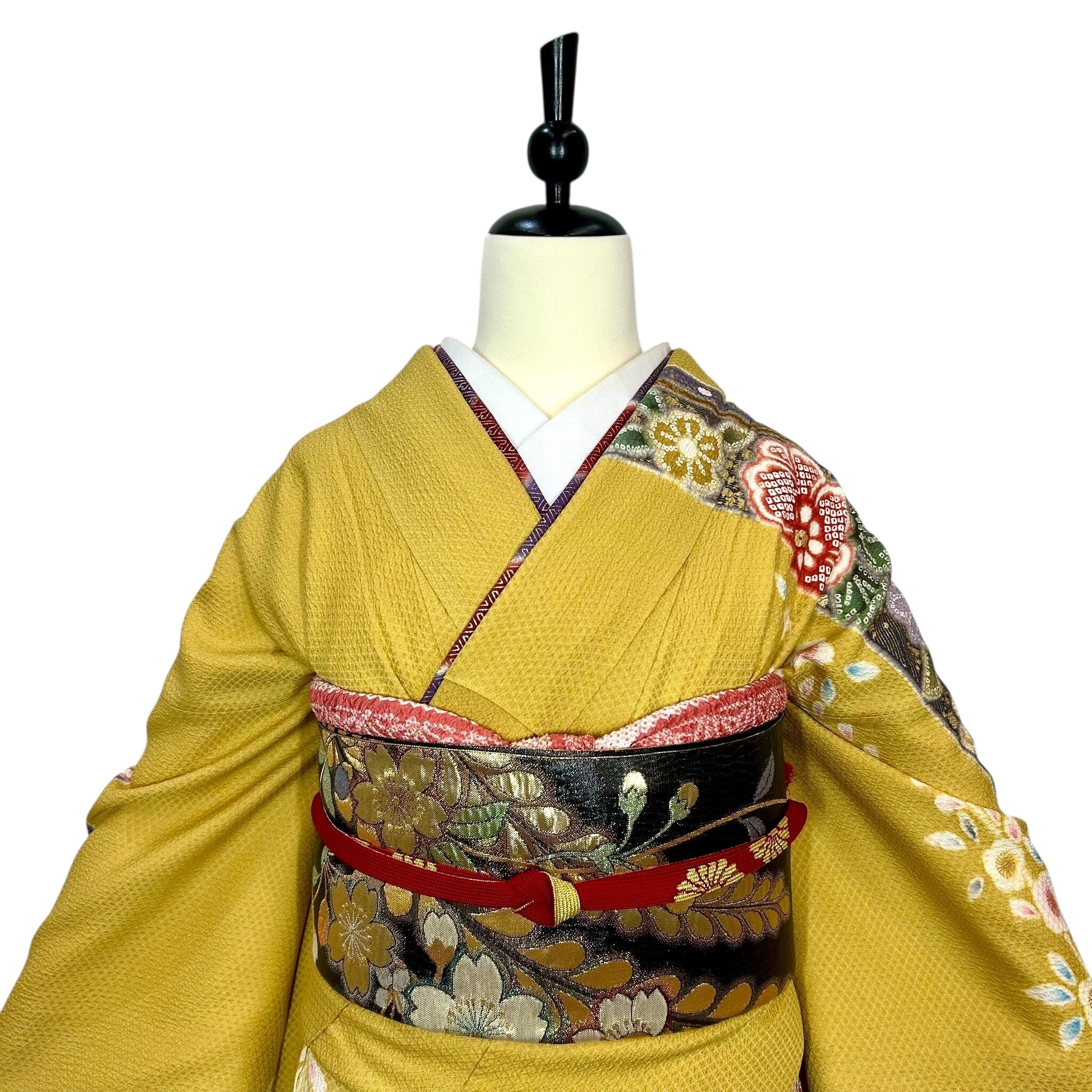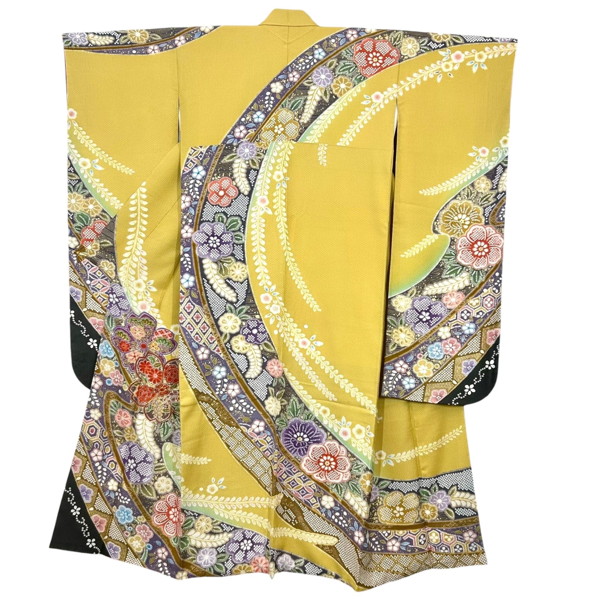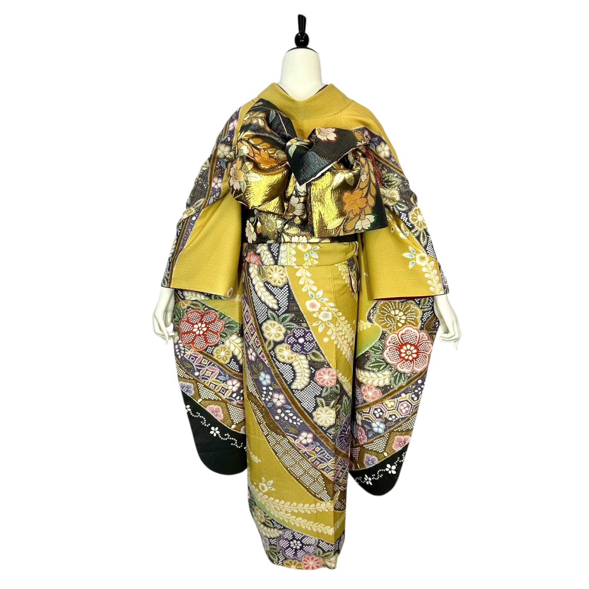 鮮やかな黄色の地色に疋田の熨斗目文様が華やかな振袖
