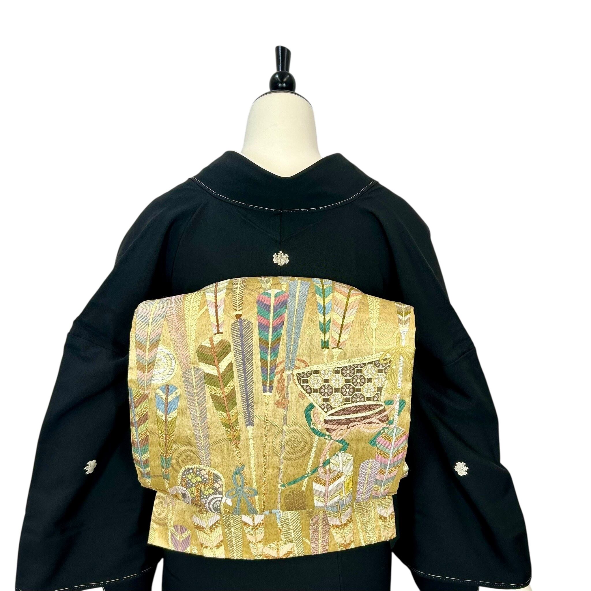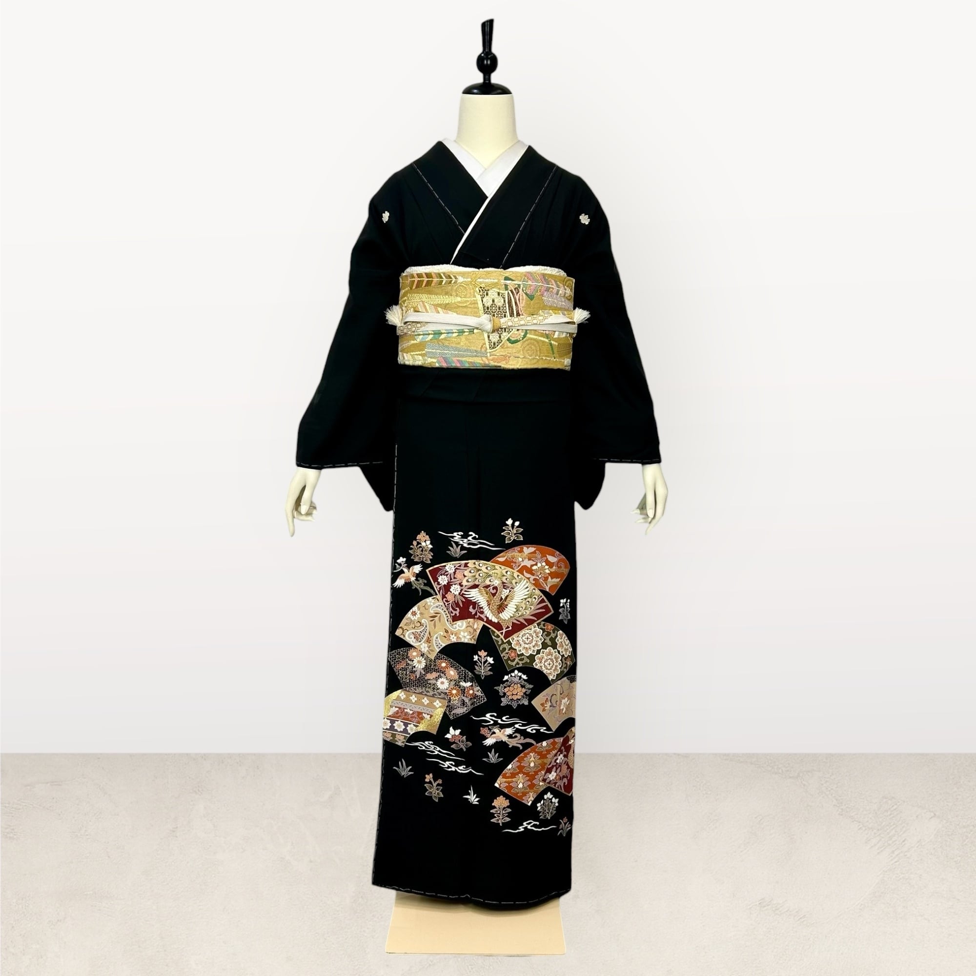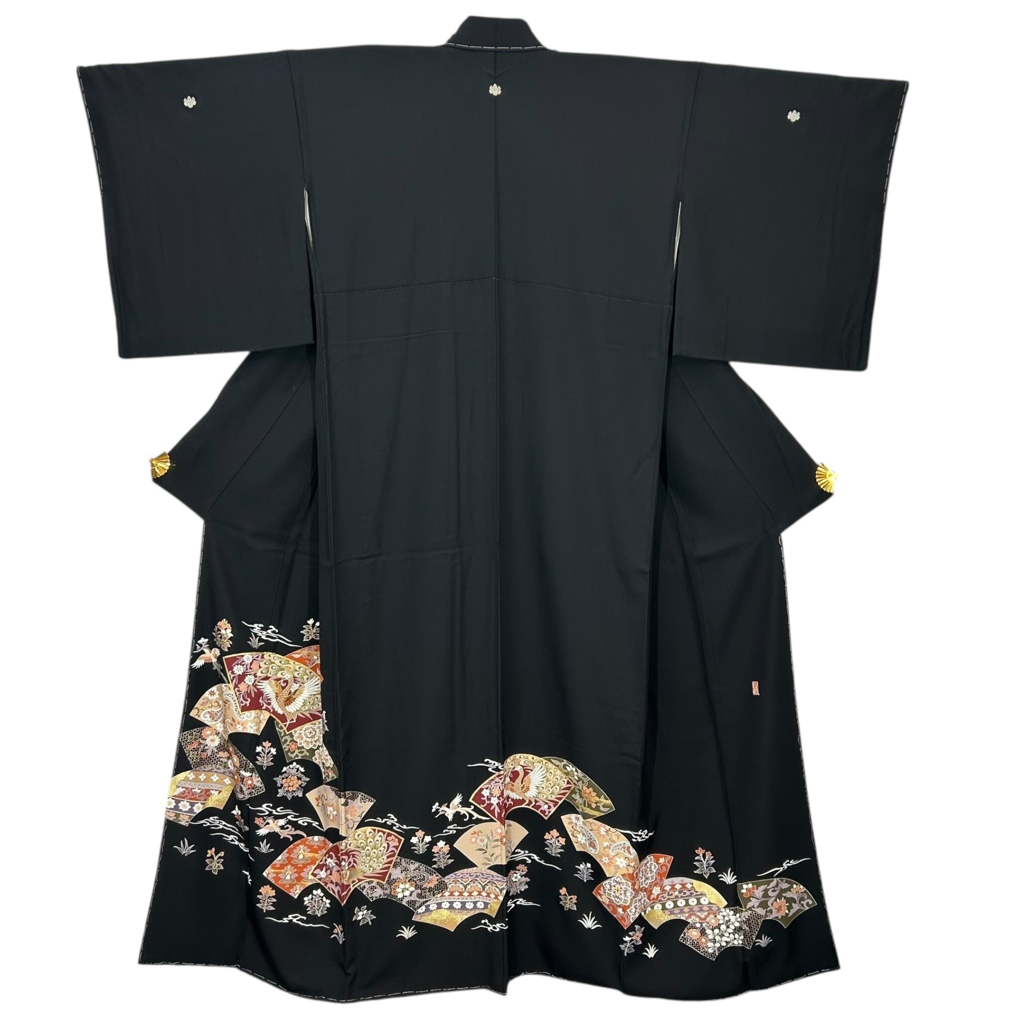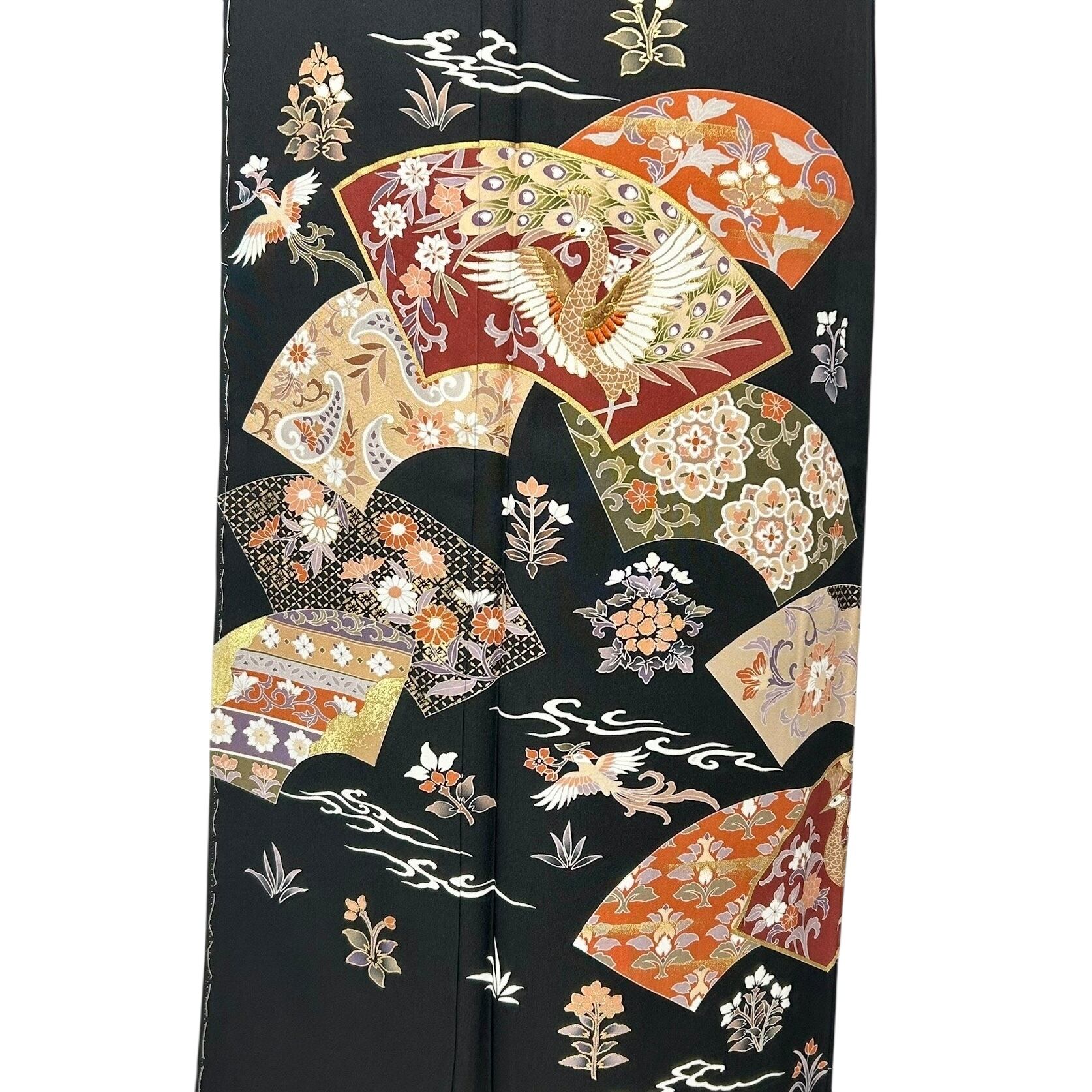 扇の地紙に描かれた孔雀や宝相華、花喰鳥などの文様が異国情緒漂う華やかな黒留袖