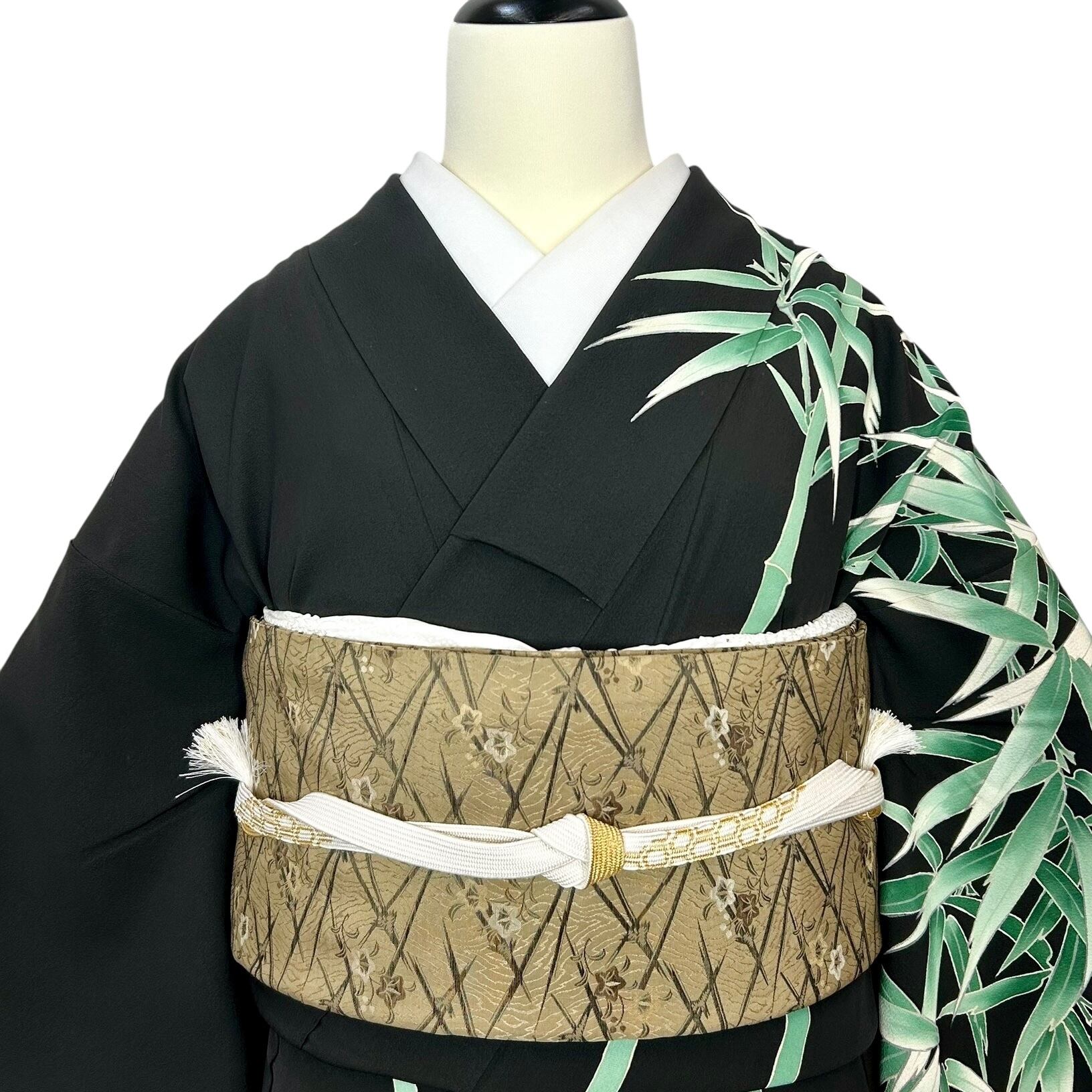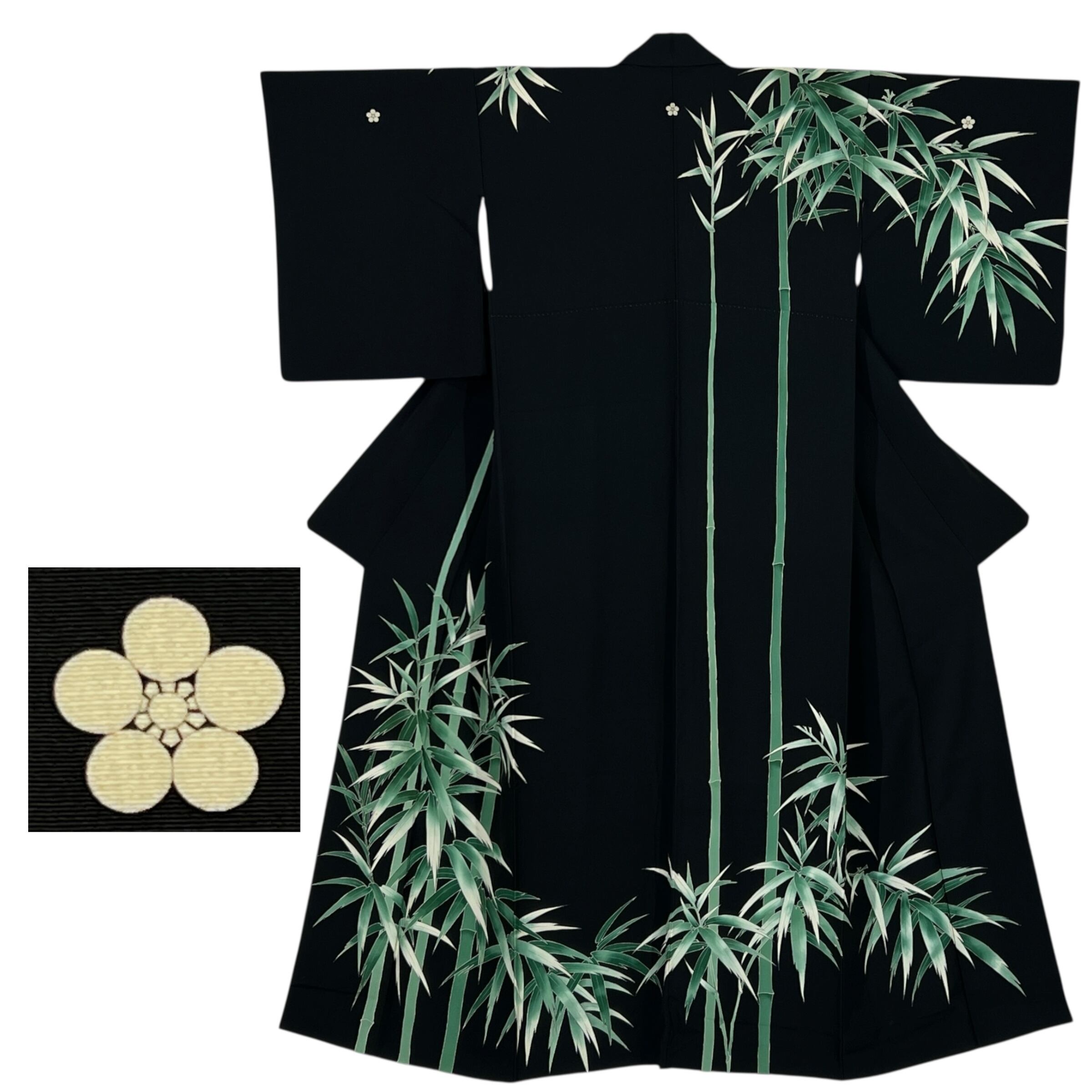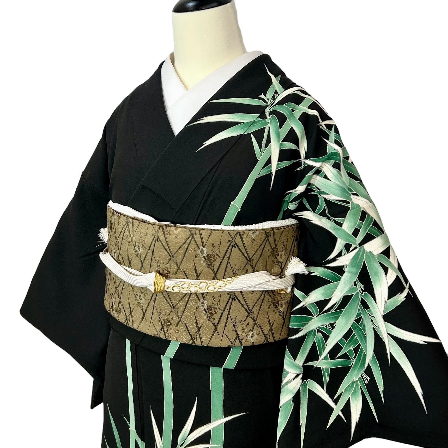 黒の地色に笹竹文様が大胆に描かれた華やかな訪問着(三つ紋)です