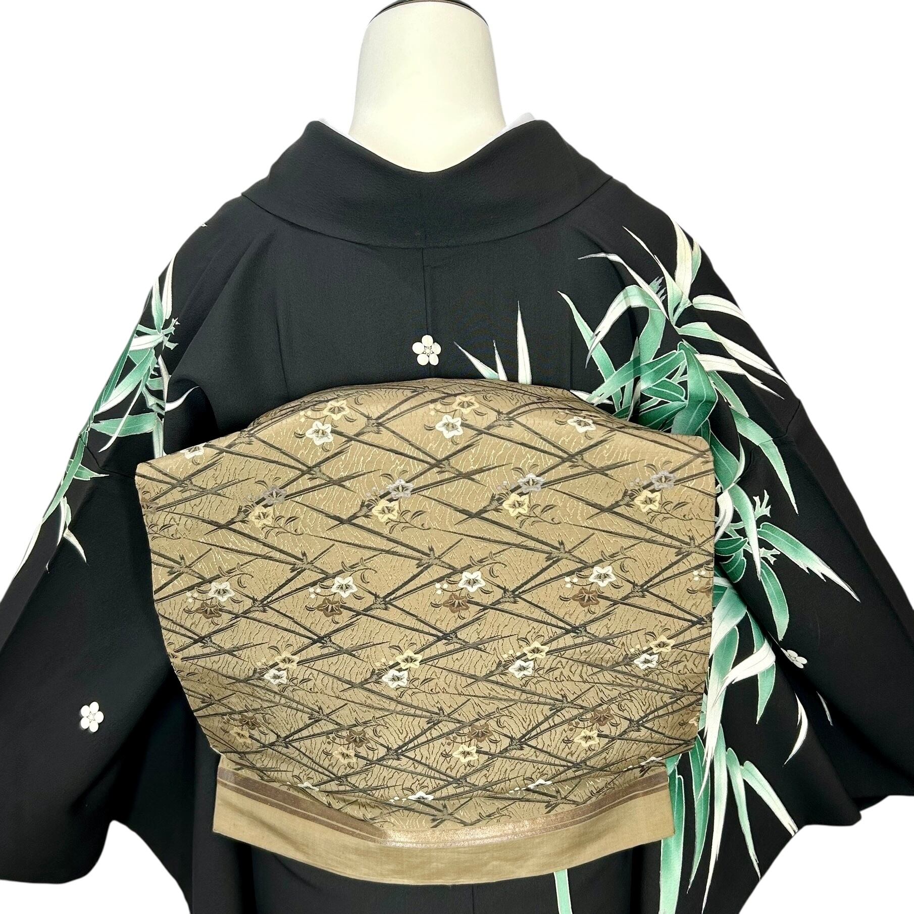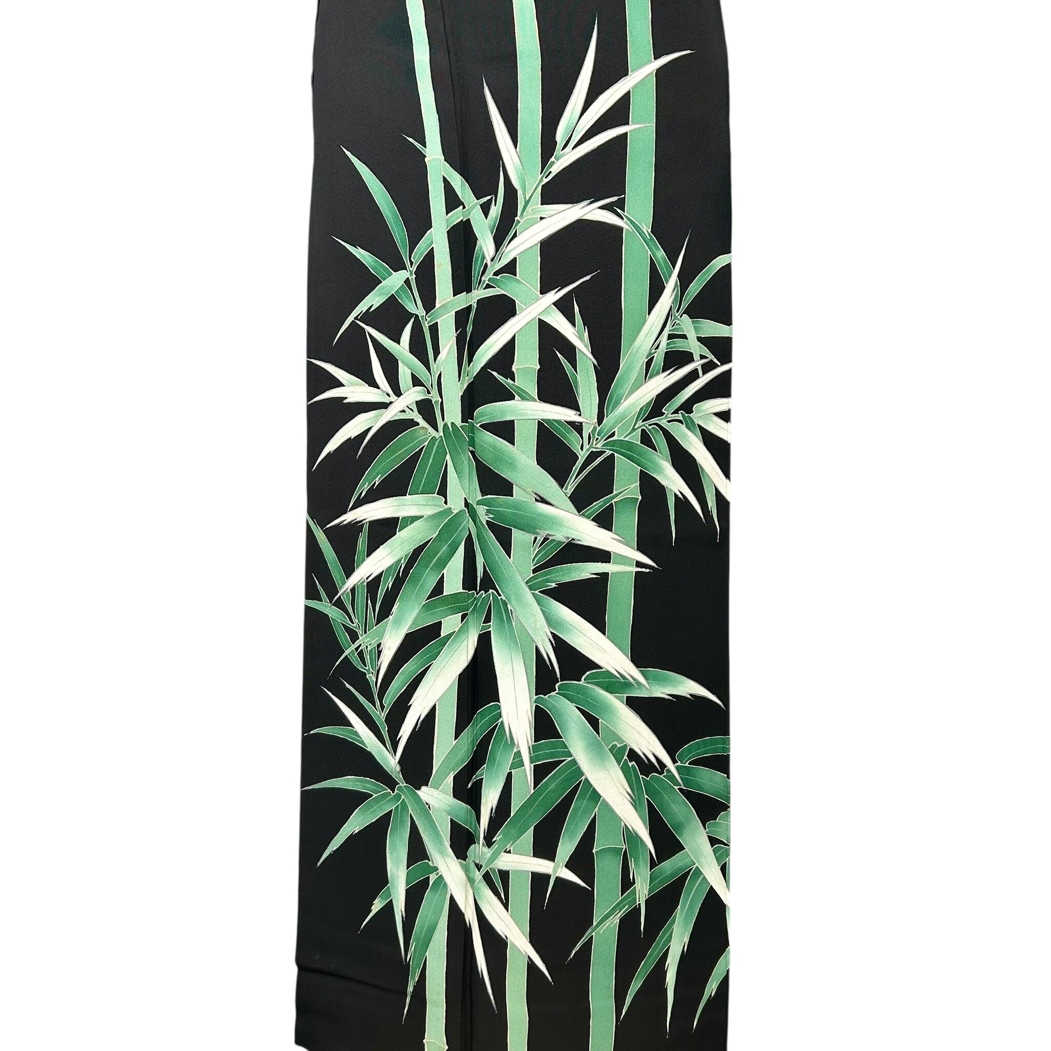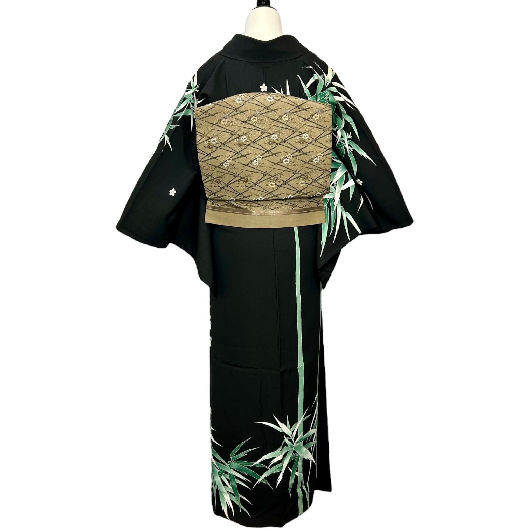 黒の地色に笹竹文様が大胆に描かれた華やかな訪問着(三つ紋)です