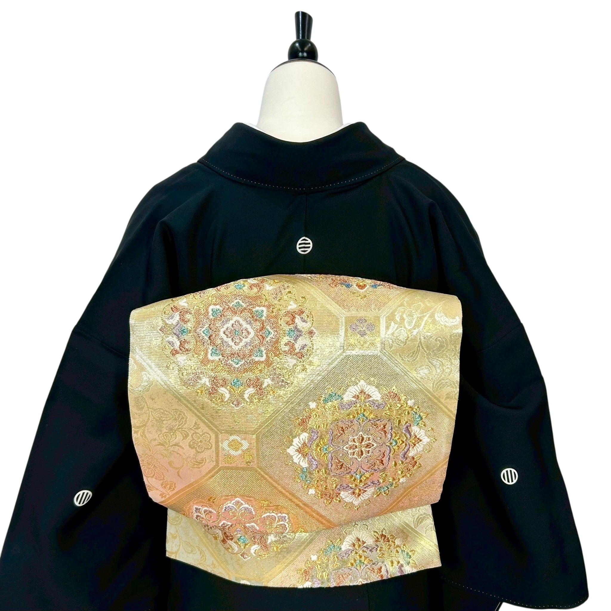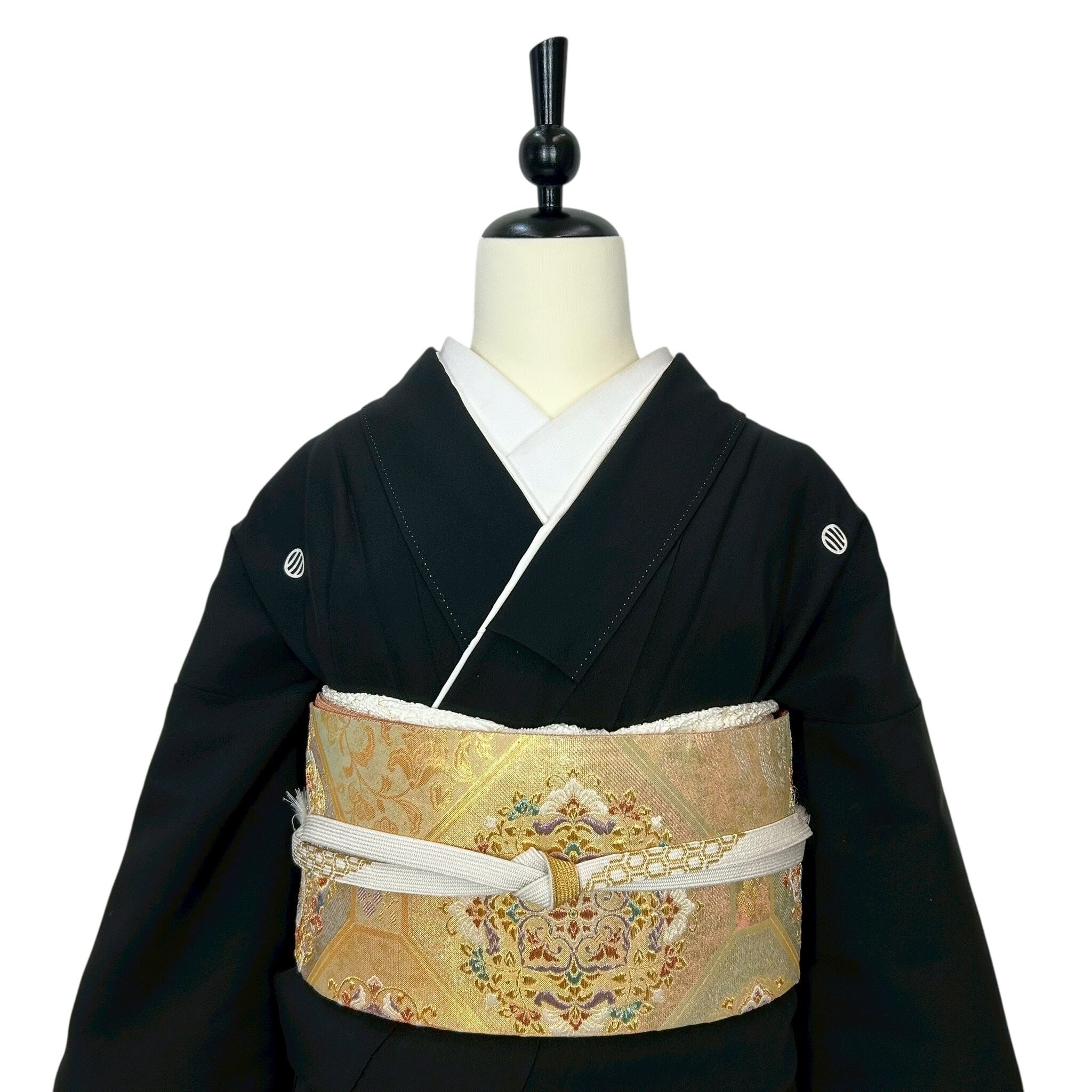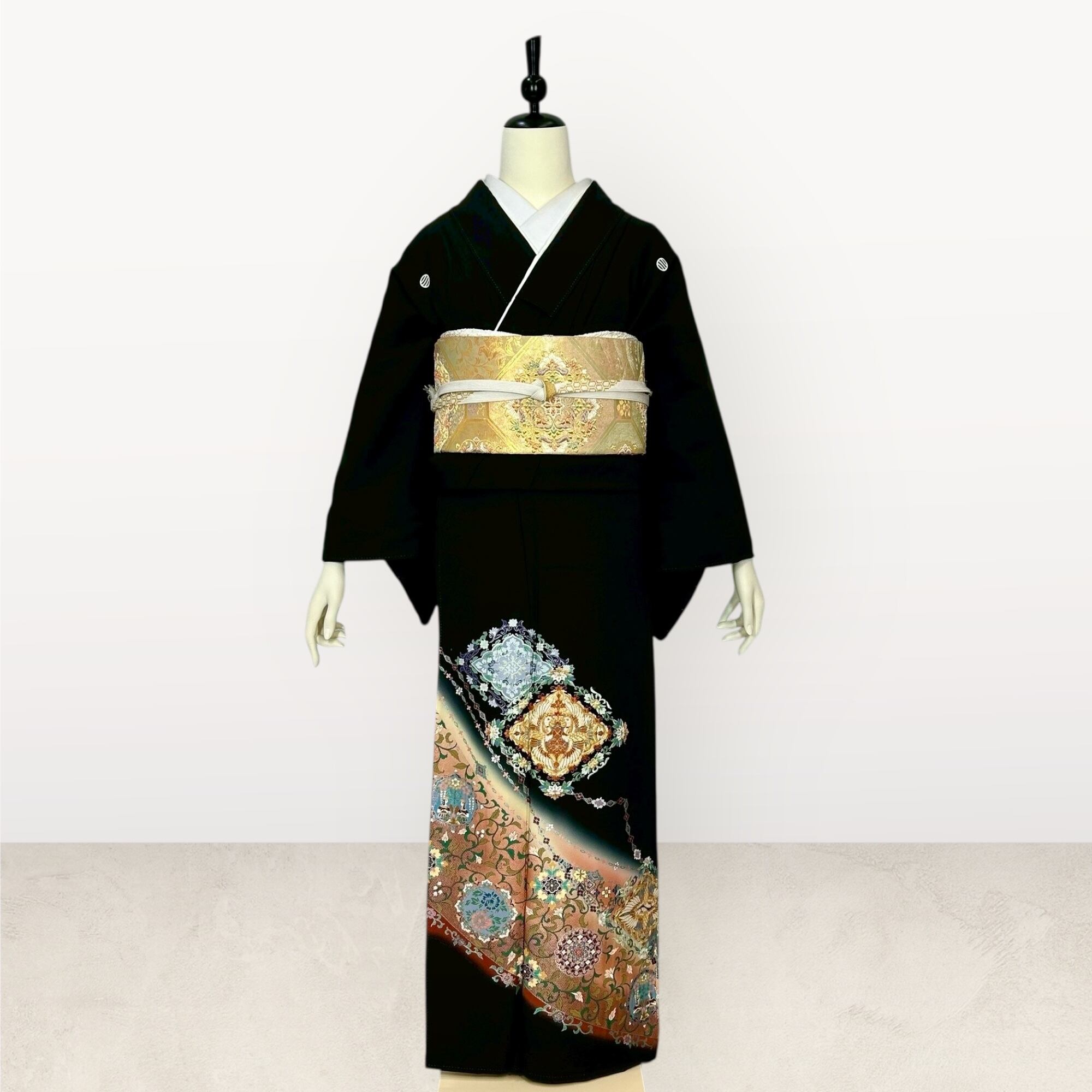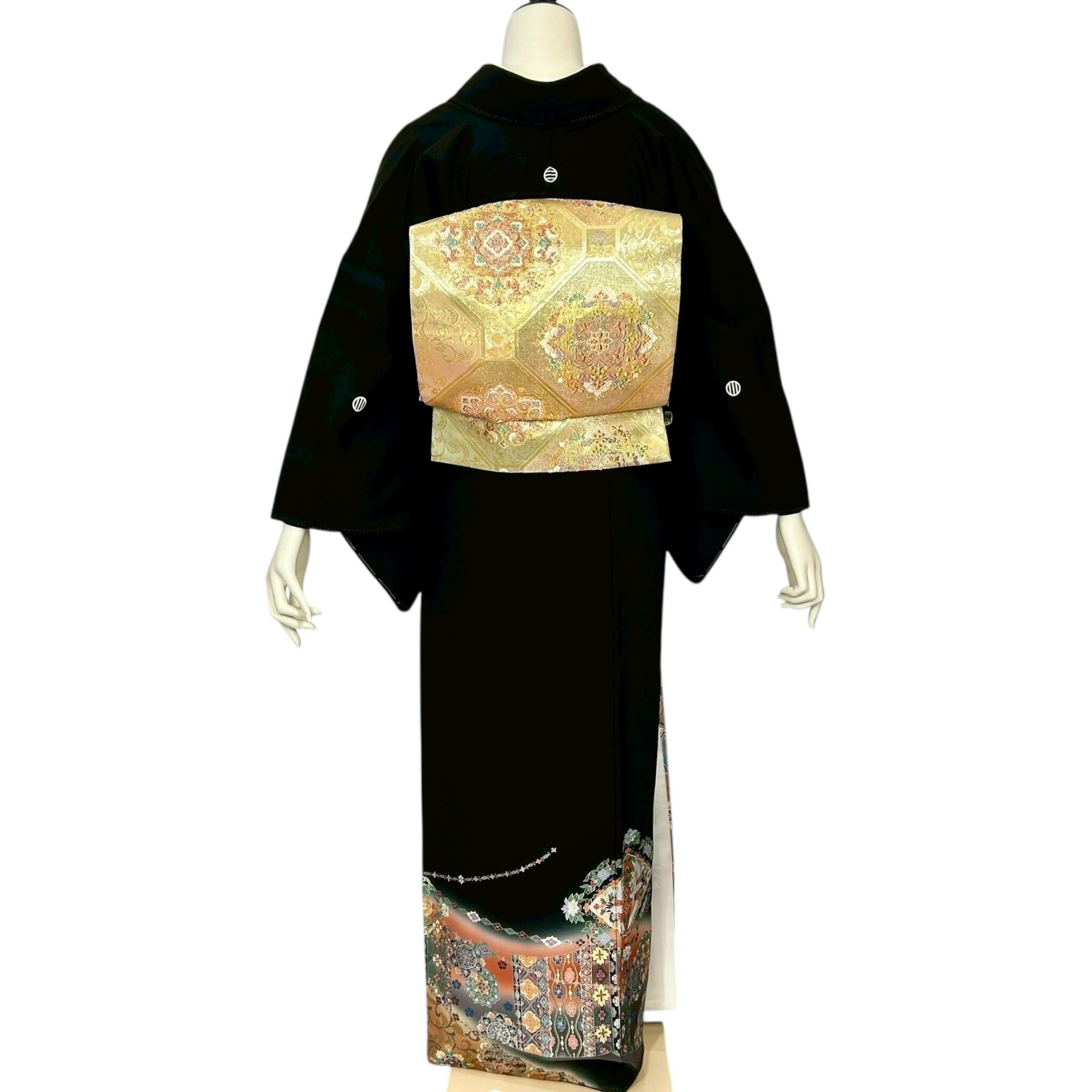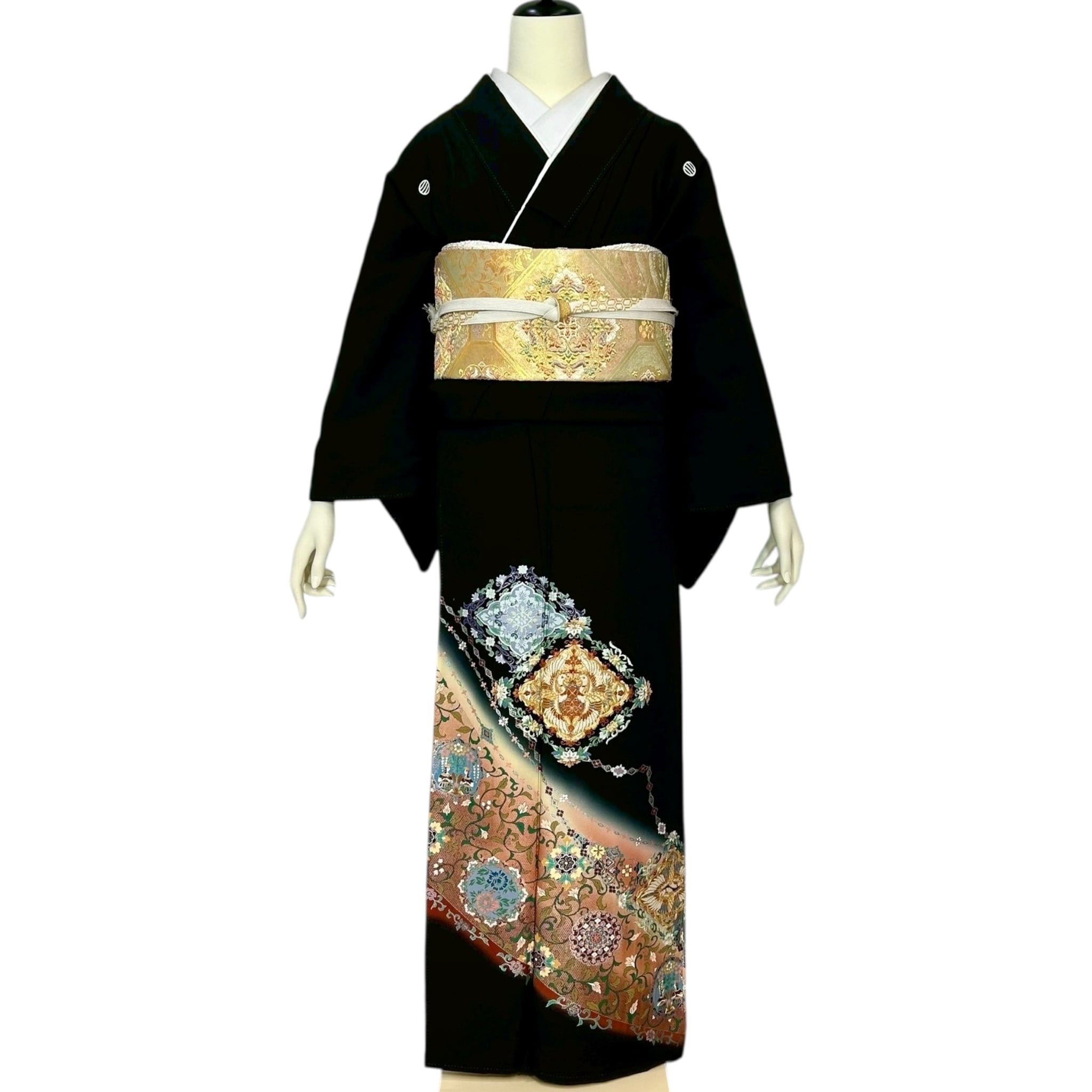 鳳凰や宝相華や唐草など異国情緒漂う文様が華やかな黒留袖 お喜びのお席に花を添える上品な黒留袖です。 着物着用シーン:結婚式・披露宴・パーティーなど 身丈:166cm 裄丈:66cm(肩巾:32.5cm・袖巾:33.5cm) 袖丈:49.5cm 後巾:29cm 前巾:25cm 参考サイズ:M ◆身長166cm位まで ◆ヒップ98cm位まで 仕立て:袷