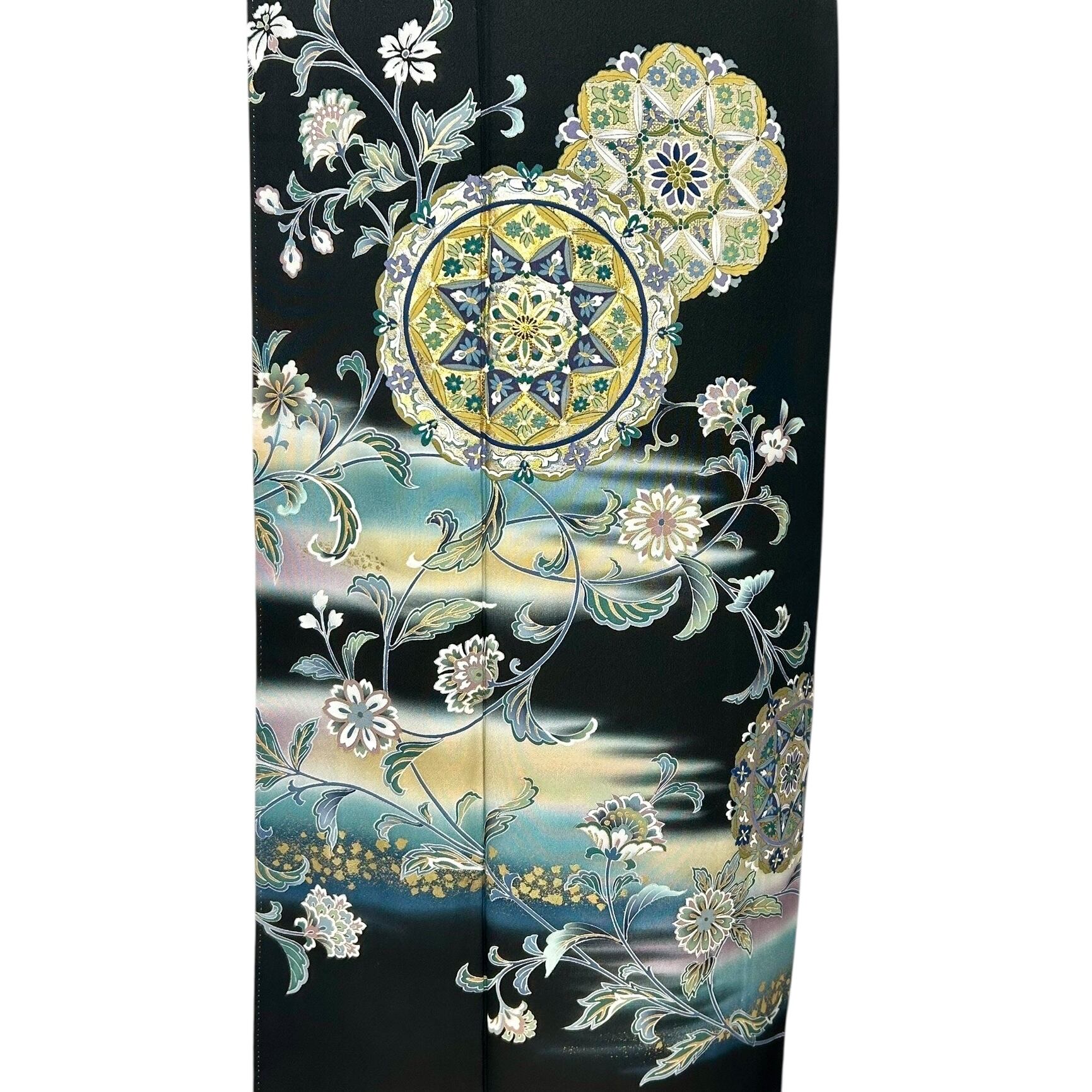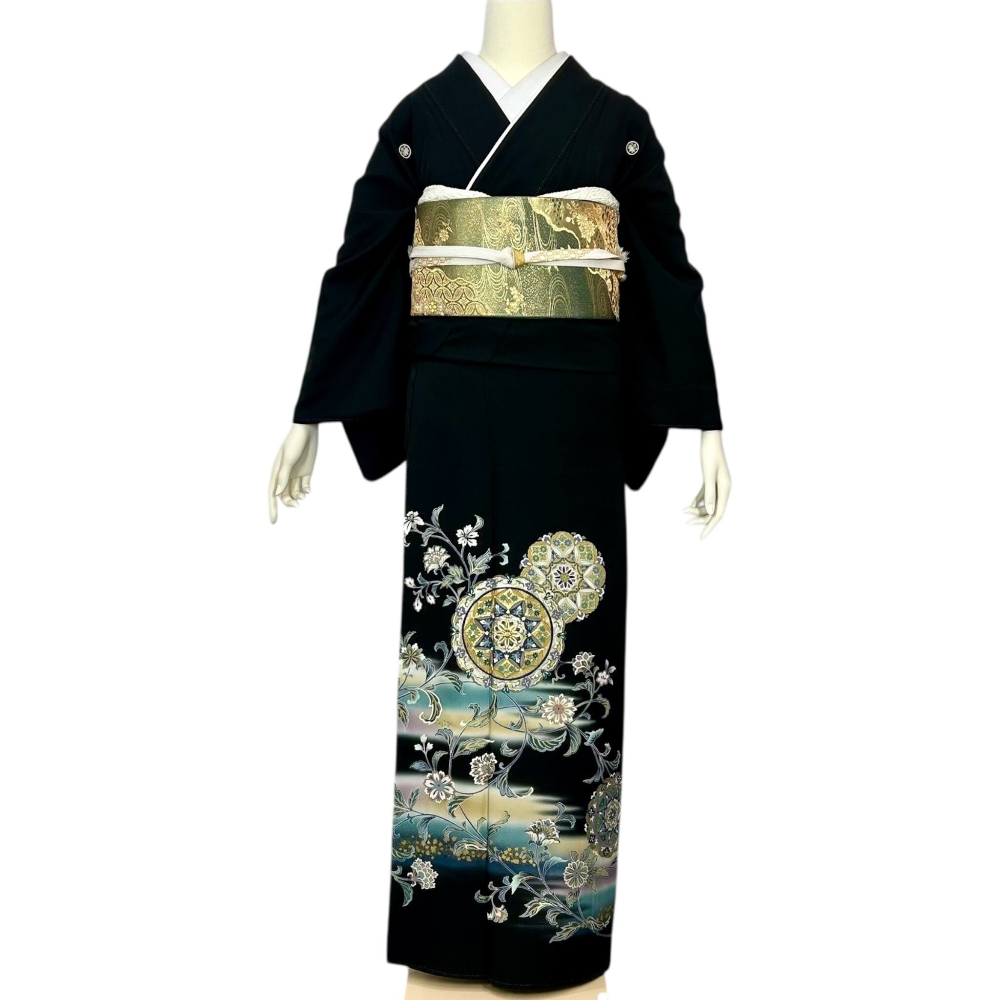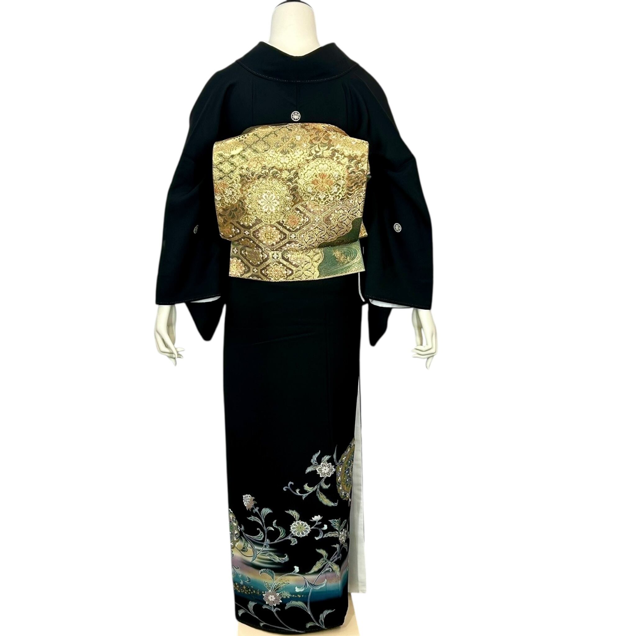 宝相華や唐花文など異国情緒漂う文様が華やかな黒留袖 お喜びのお席に花を添える上品な黒留袖です。 着物着用シーン:結婚式・披露宴・パーティーなど 身丈:161cm 裄丈:65cm(肩巾:31cm・袖巾:34cm) 袖丈:48.5cm 後巾:30cm 前巾:24cm 参考サイズ:M ◆身長161cm位まで ◆ヒップ99cm位まで 仕立て:袷