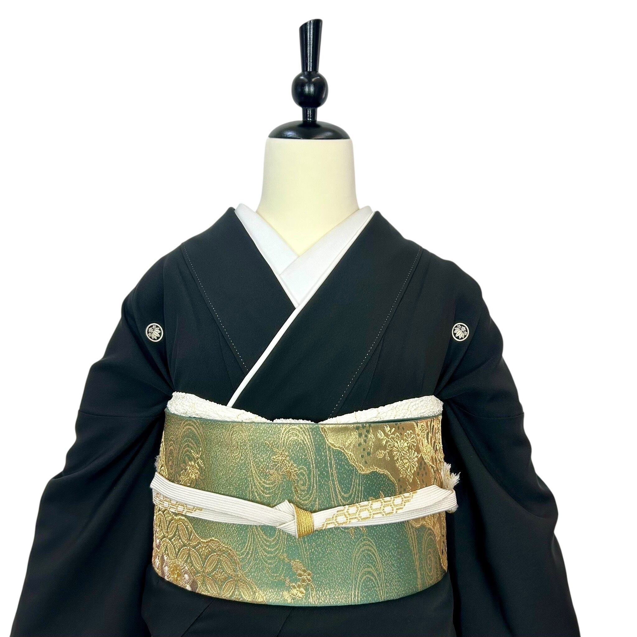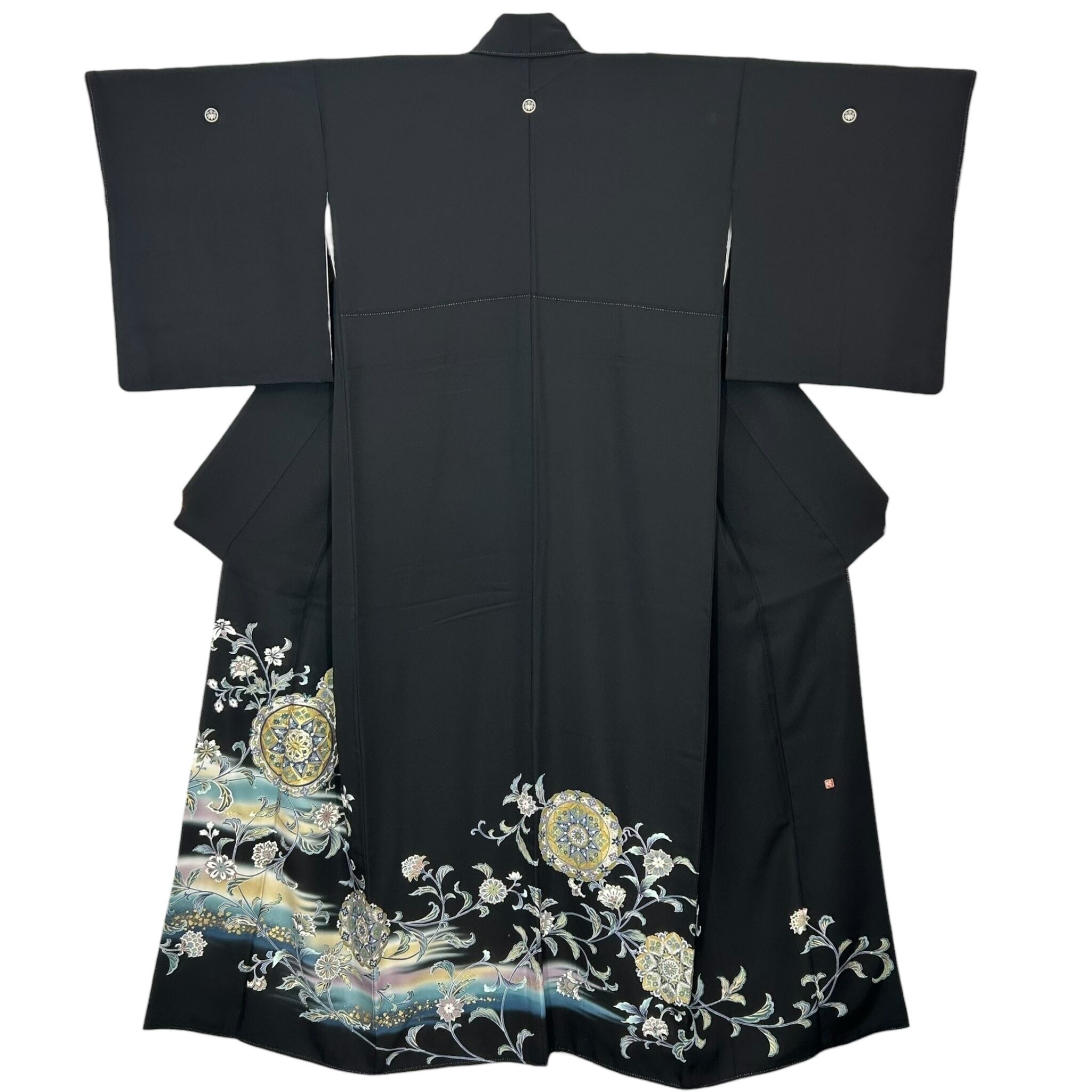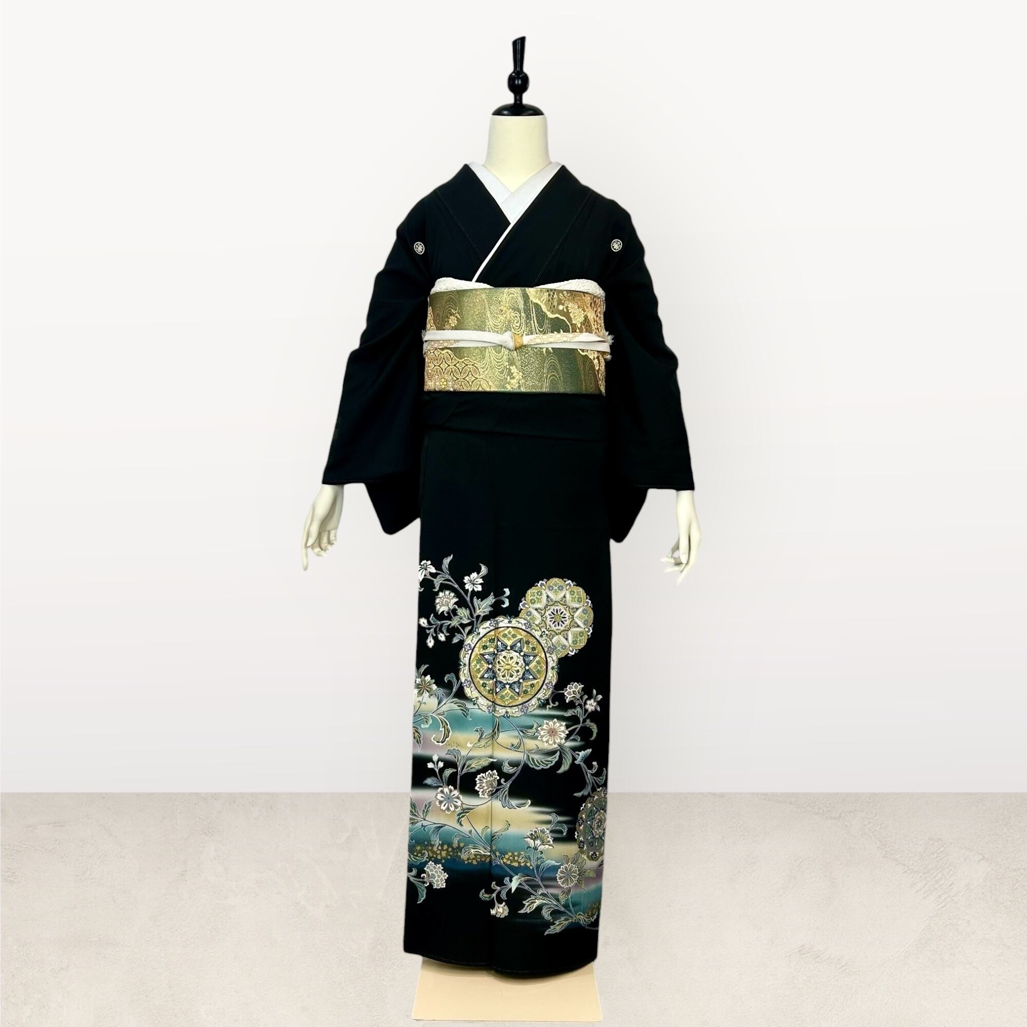 宝相華や唐花文など異国情緒漂う文様が華やかな黒留袖 お喜びのお席に花を添える上品な黒留袖です。 着物着用シーン:結婚式・披露宴・パーティーなど 身丈:161cm 裄丈:65cm(肩巾:31cm・袖巾:34cm) 袖丈:48.5cm 後巾:30cm 前巾:24cm 参考サイズ:M ◆身長161cm位まで ◆ヒップ99cm位まで 仕立て:袷