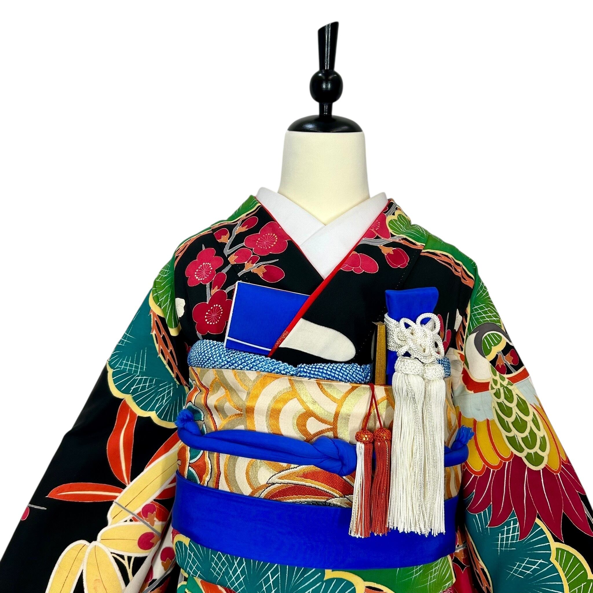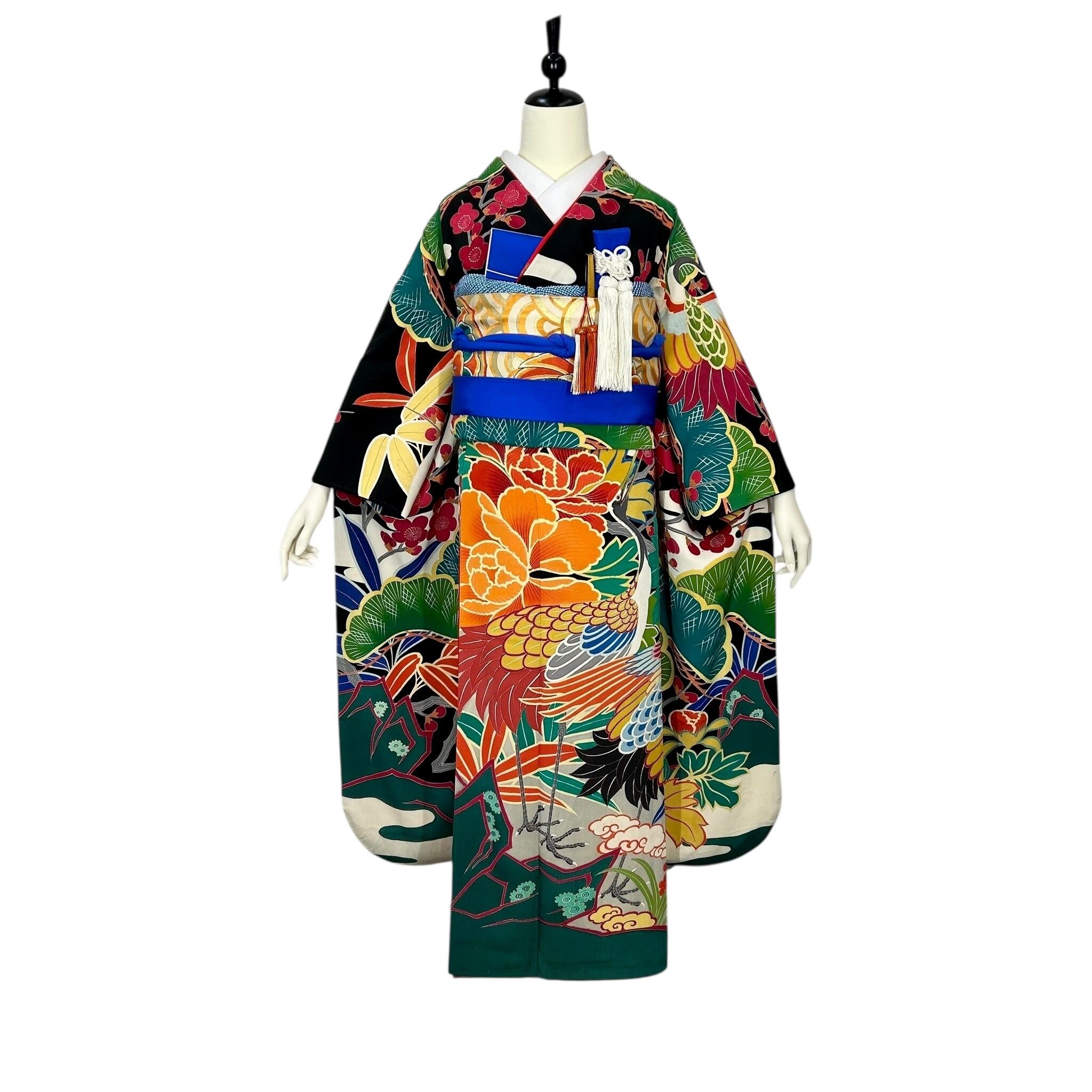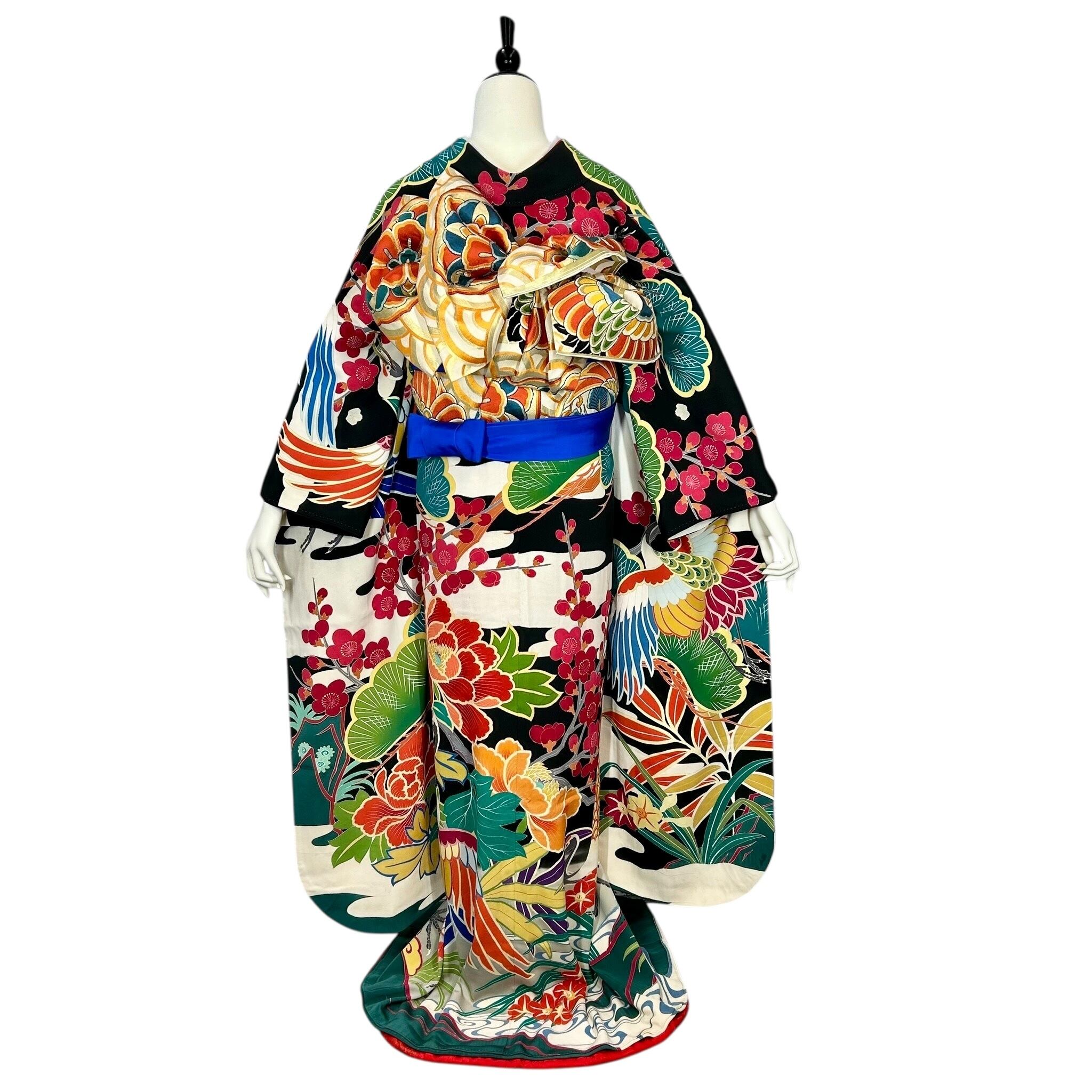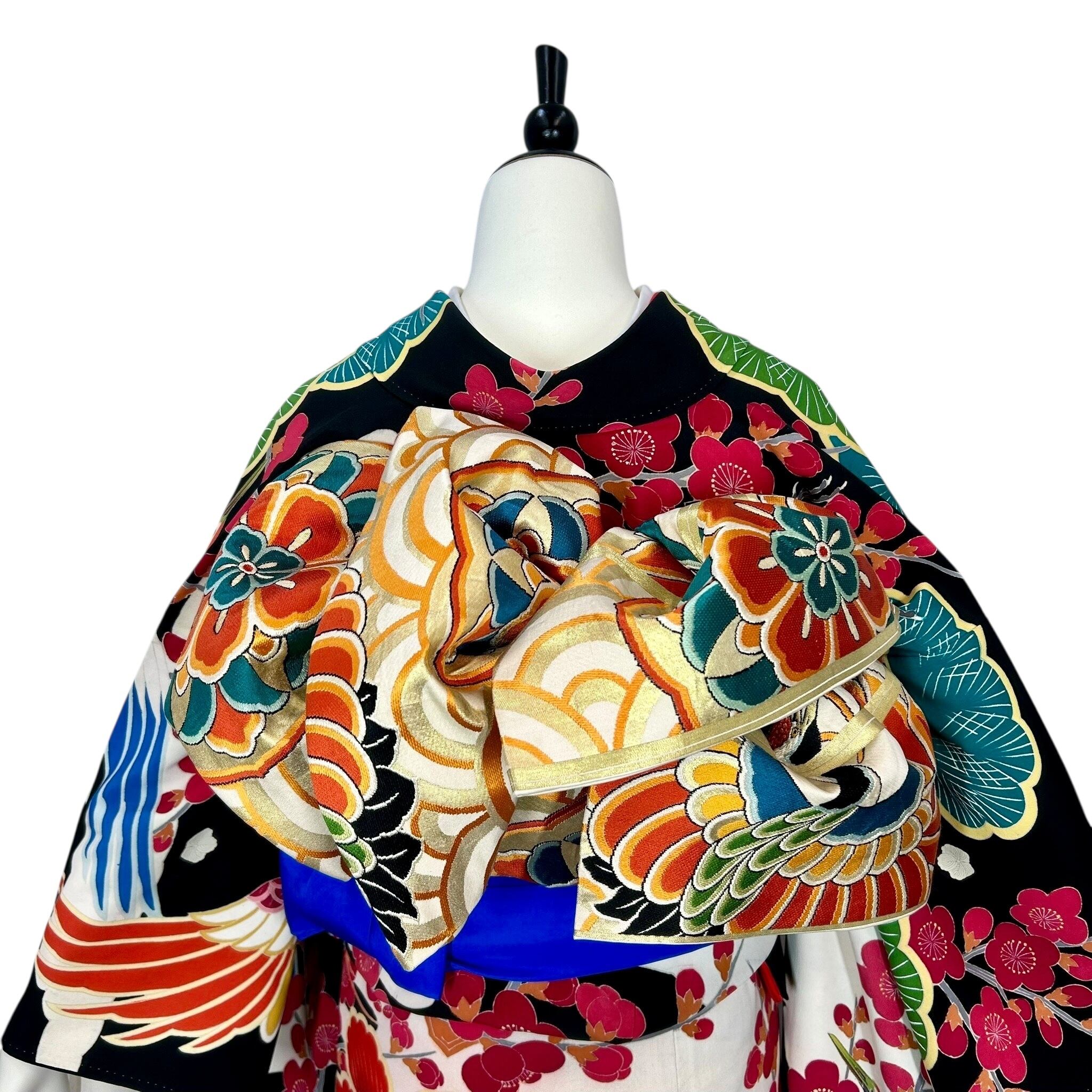 黒地に鶴や松竹梅などの吉祥文様を色鮮やかに配したアンティークならではの斬新なデザインです。
