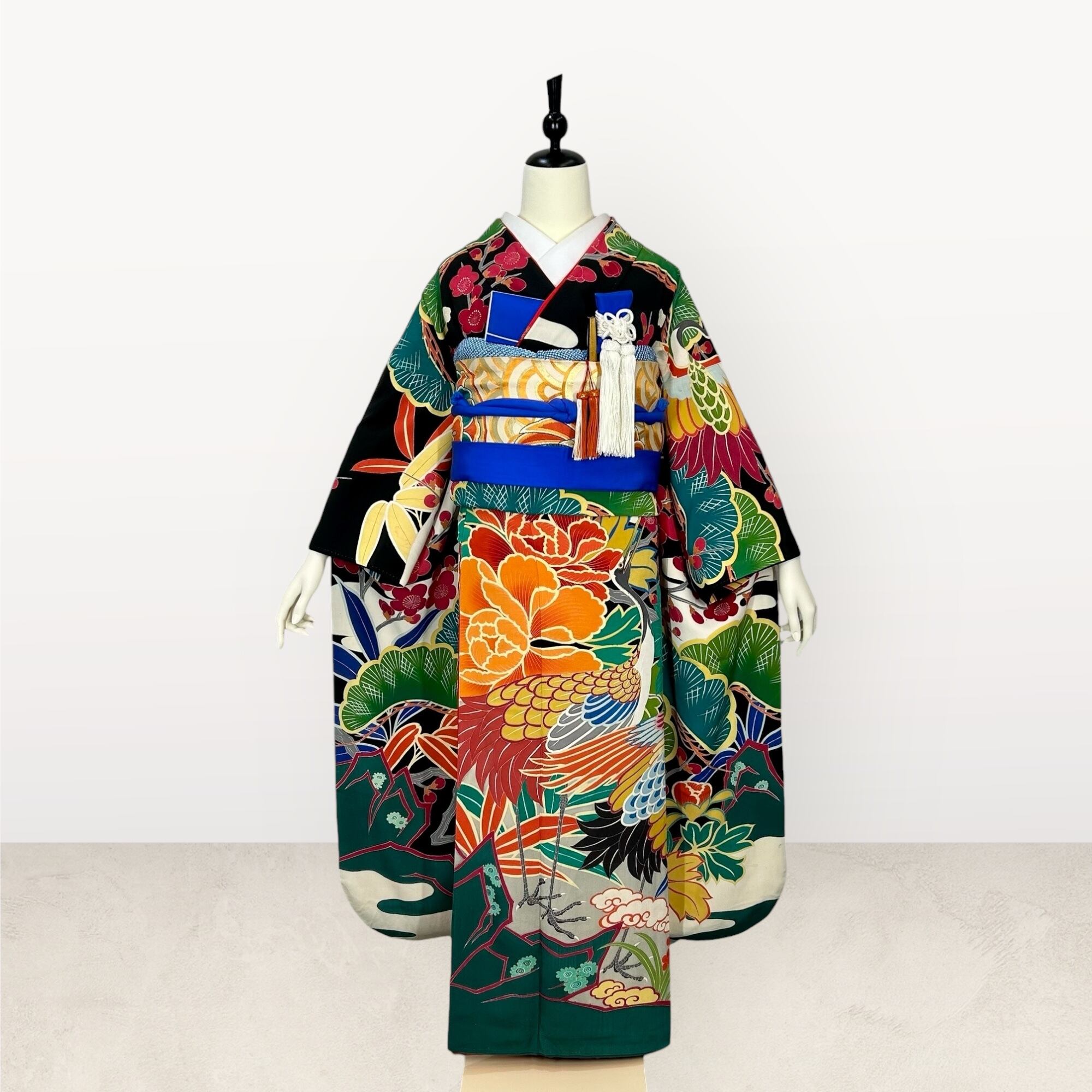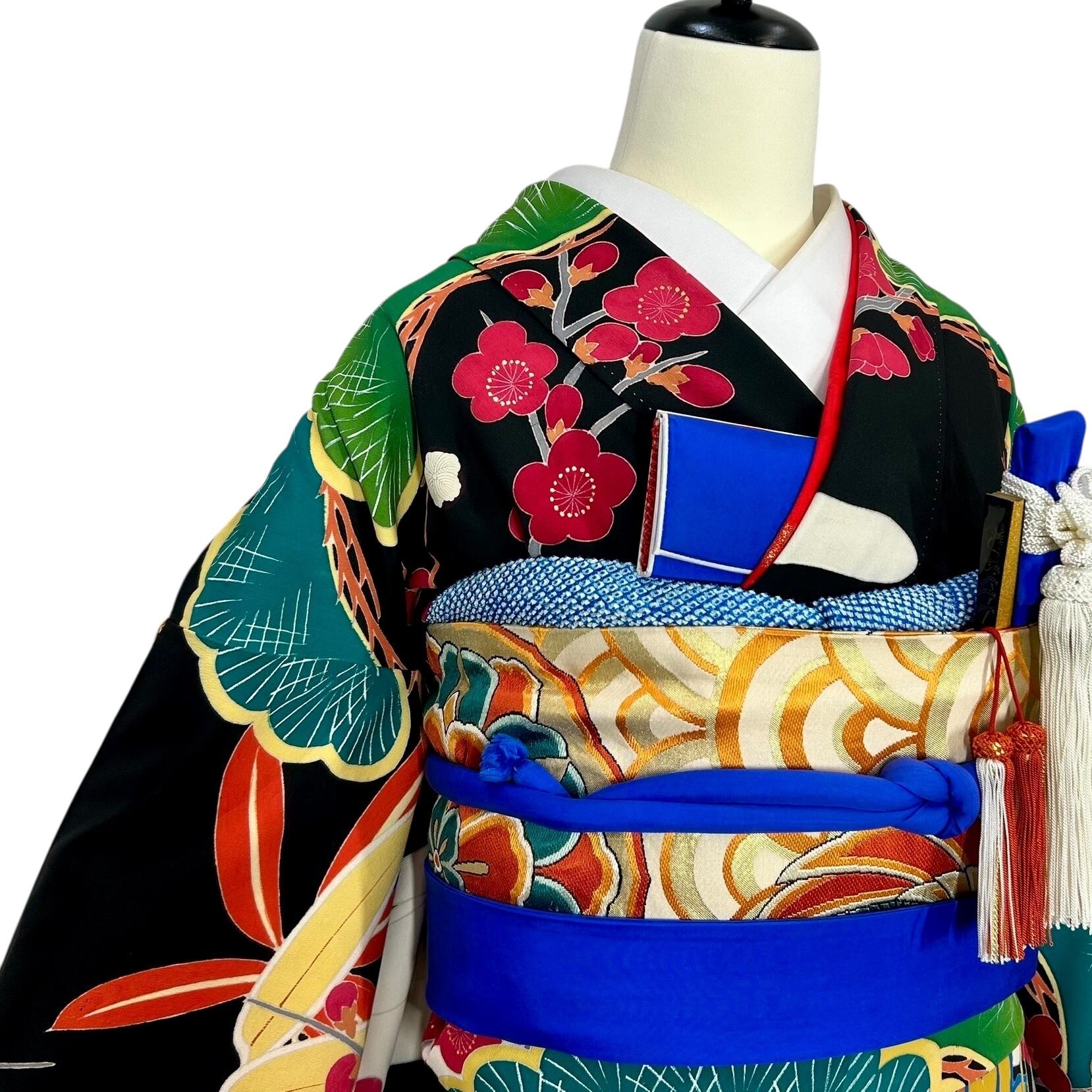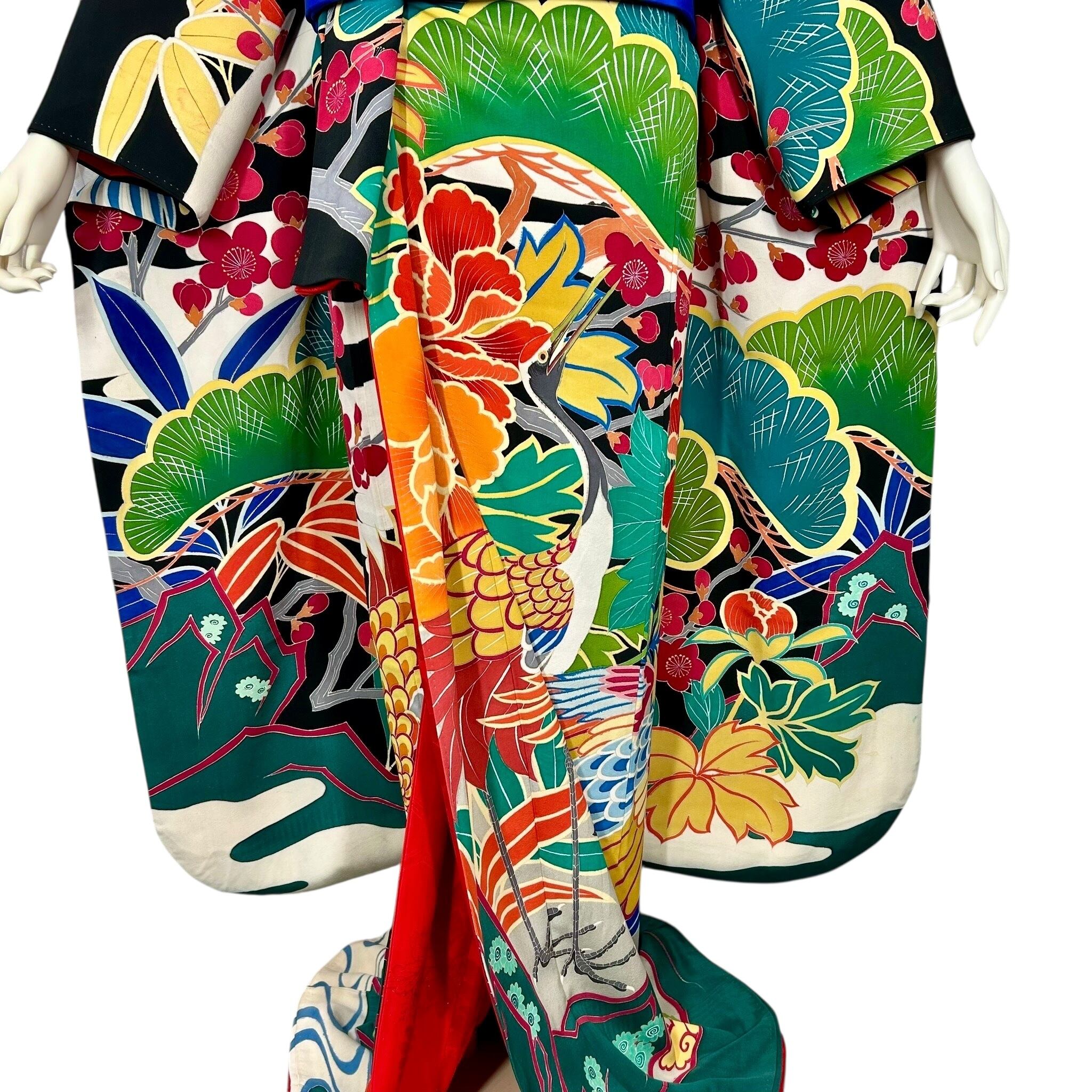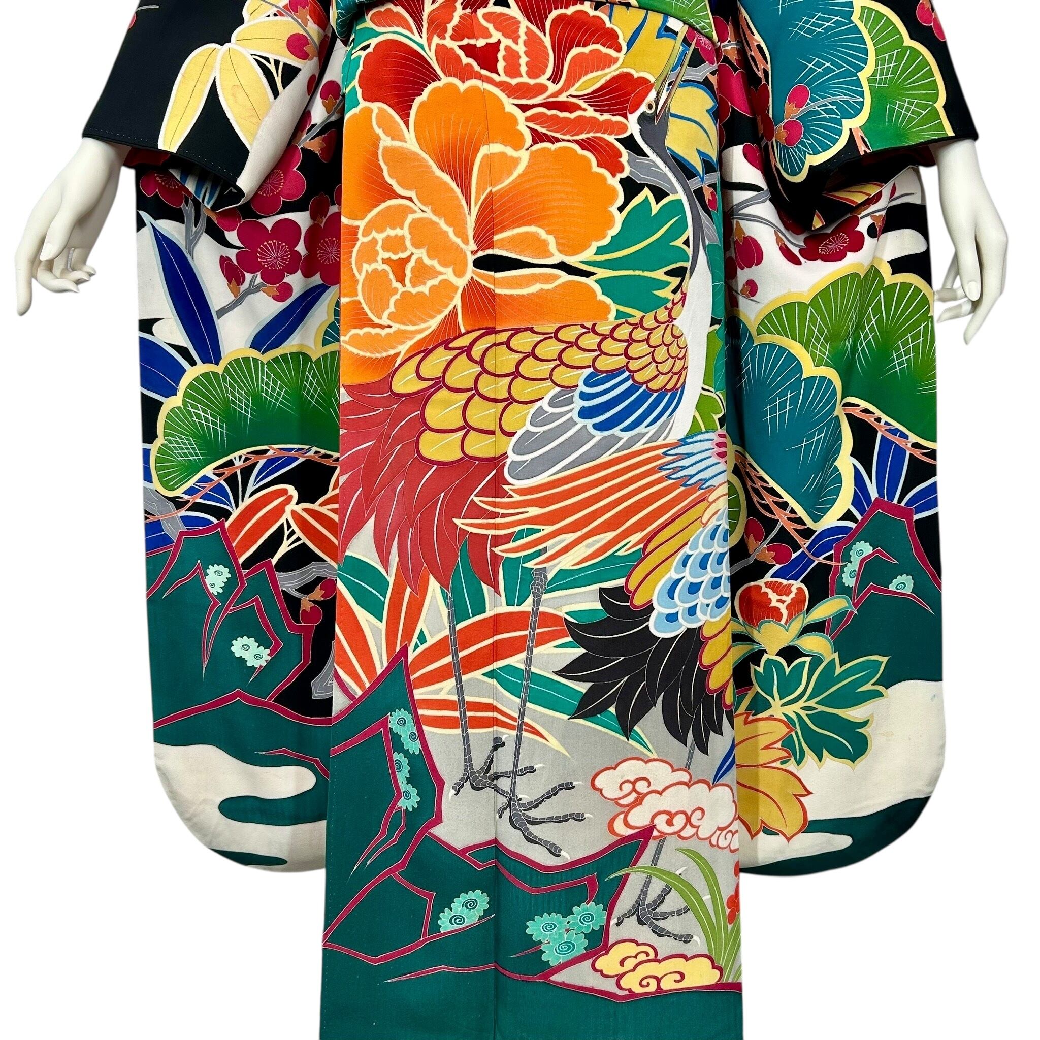 黒地に鶴や松竹梅などの吉祥文様を色鮮やかに配したアンティークならではの斬新なデザインです。