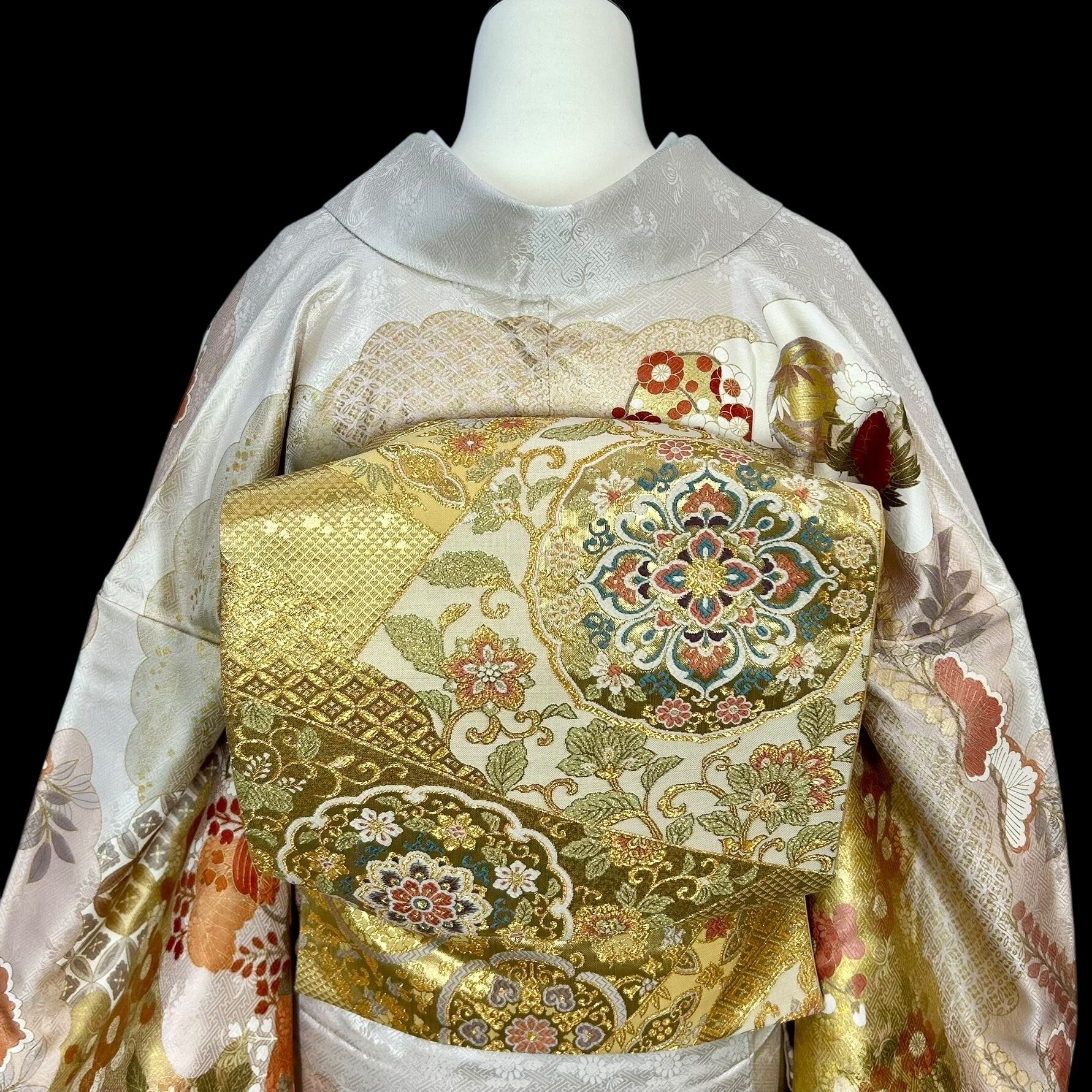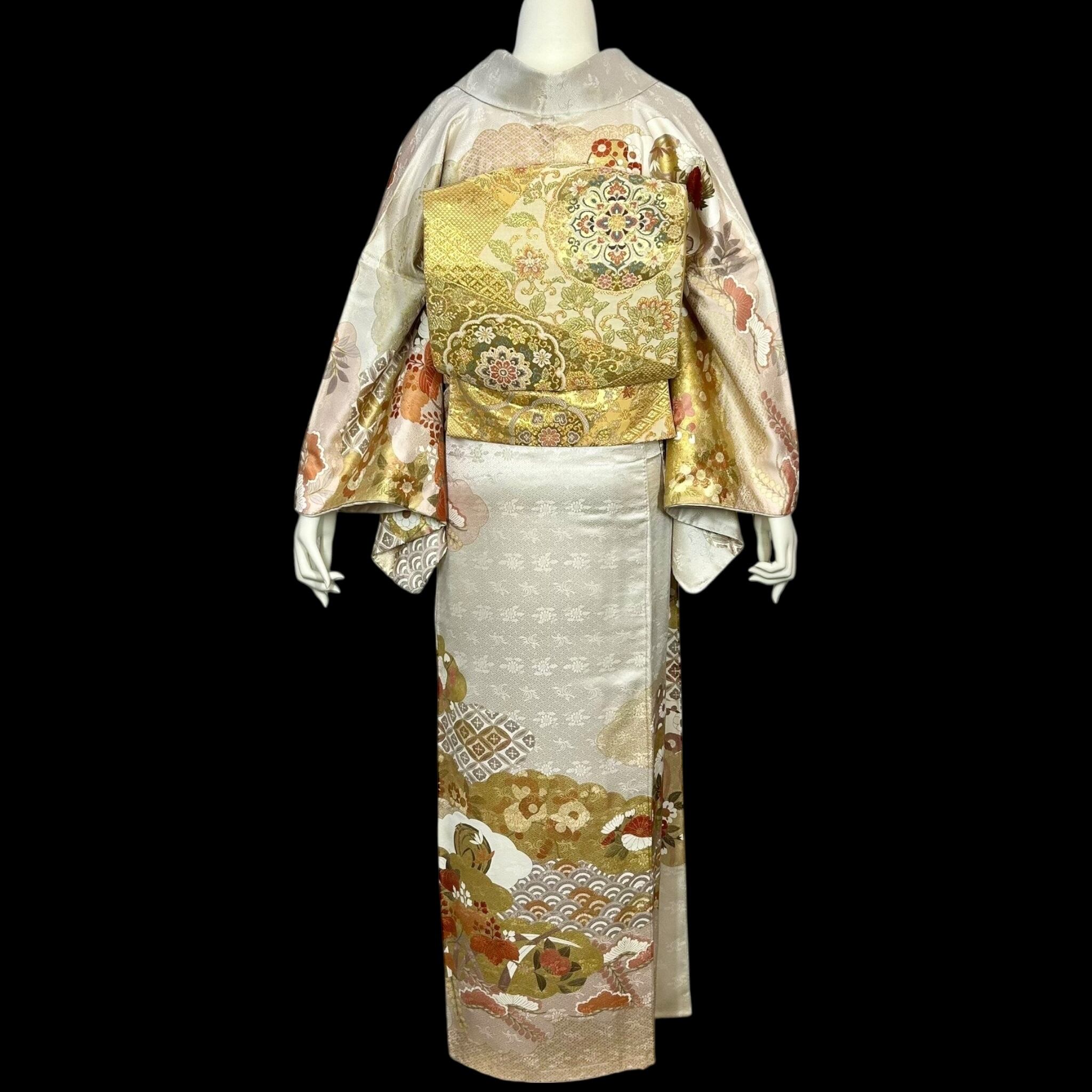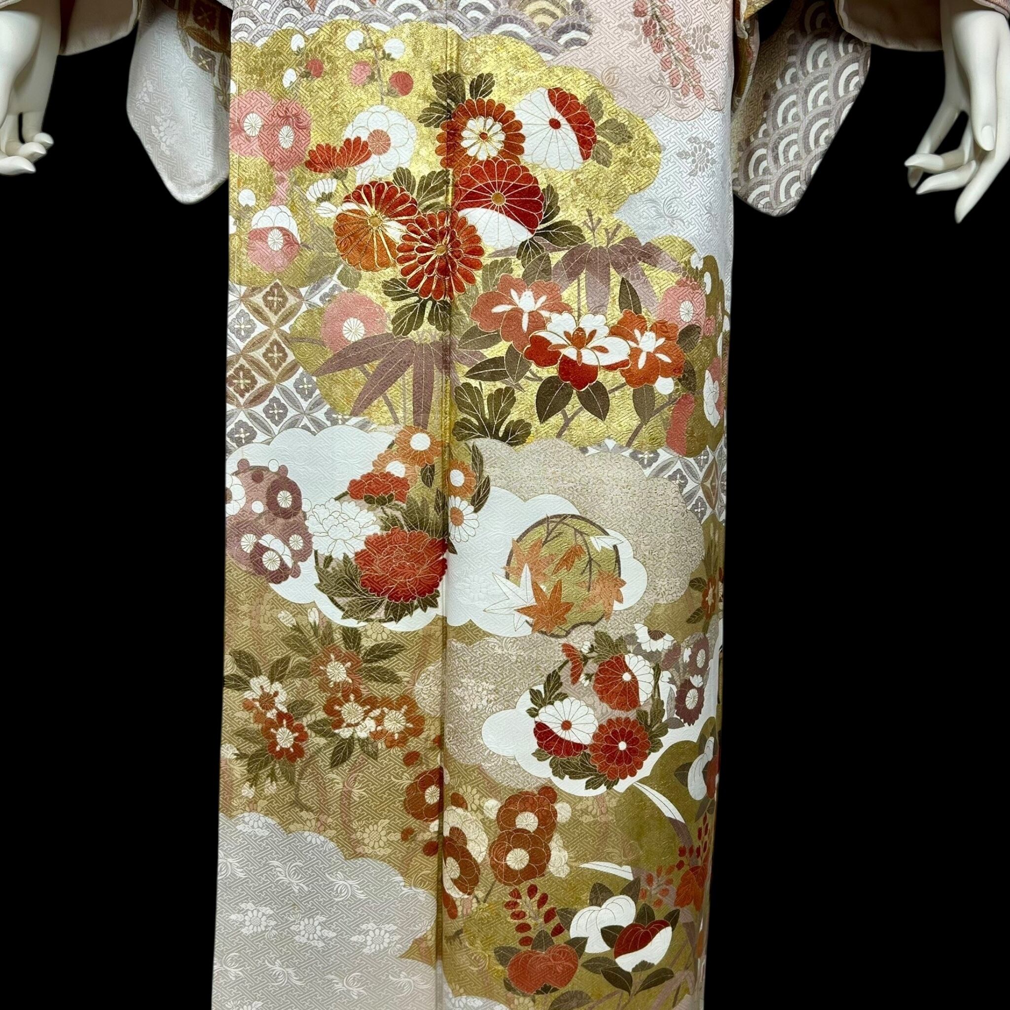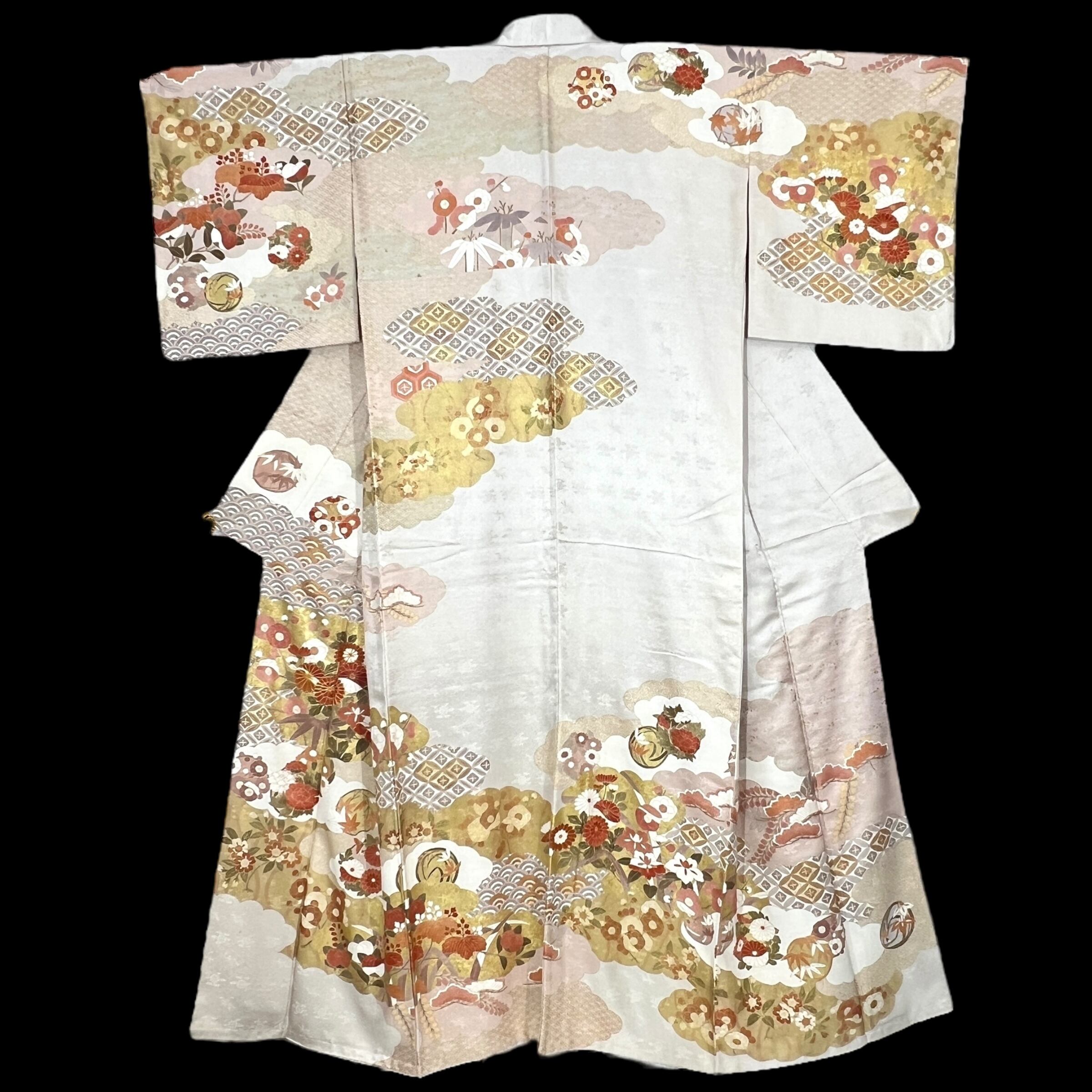 光沢のある白の地色に金彩の雲取りと青海波や花菱七宝などの吉祥文様が華やかな訪問着です