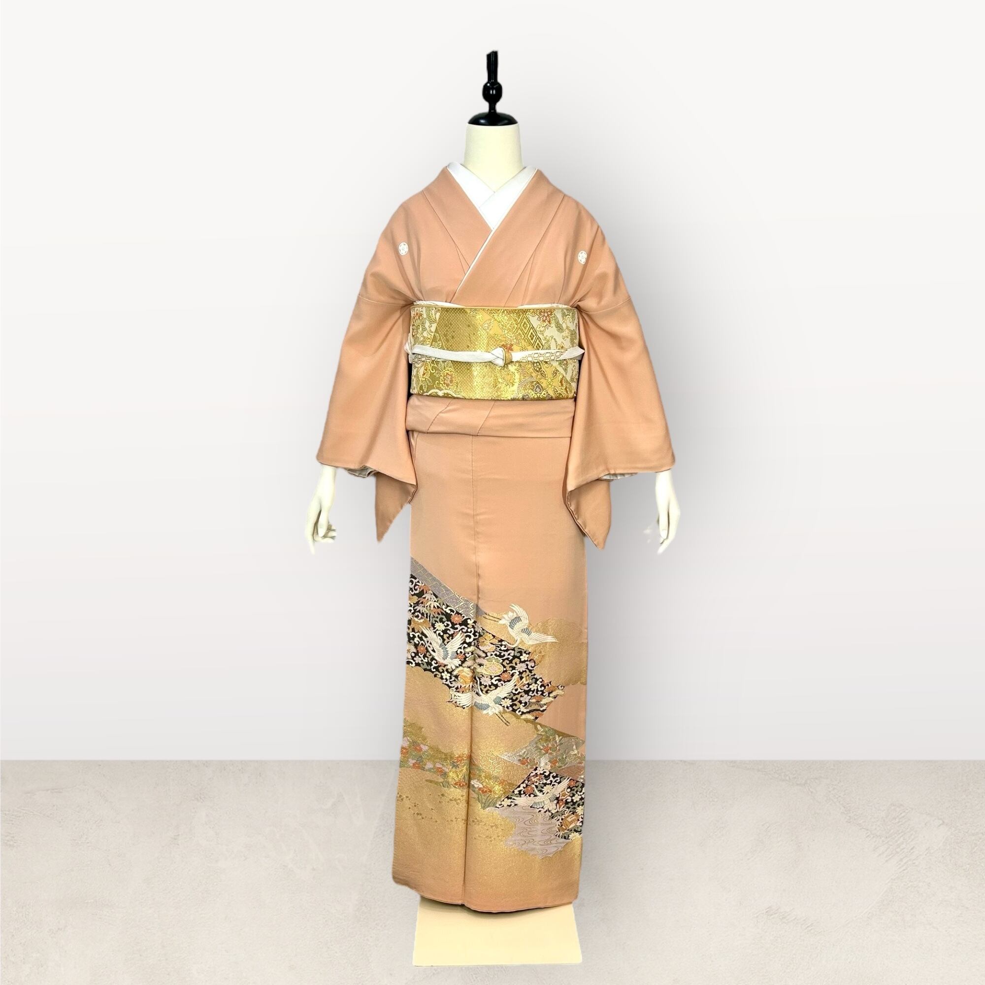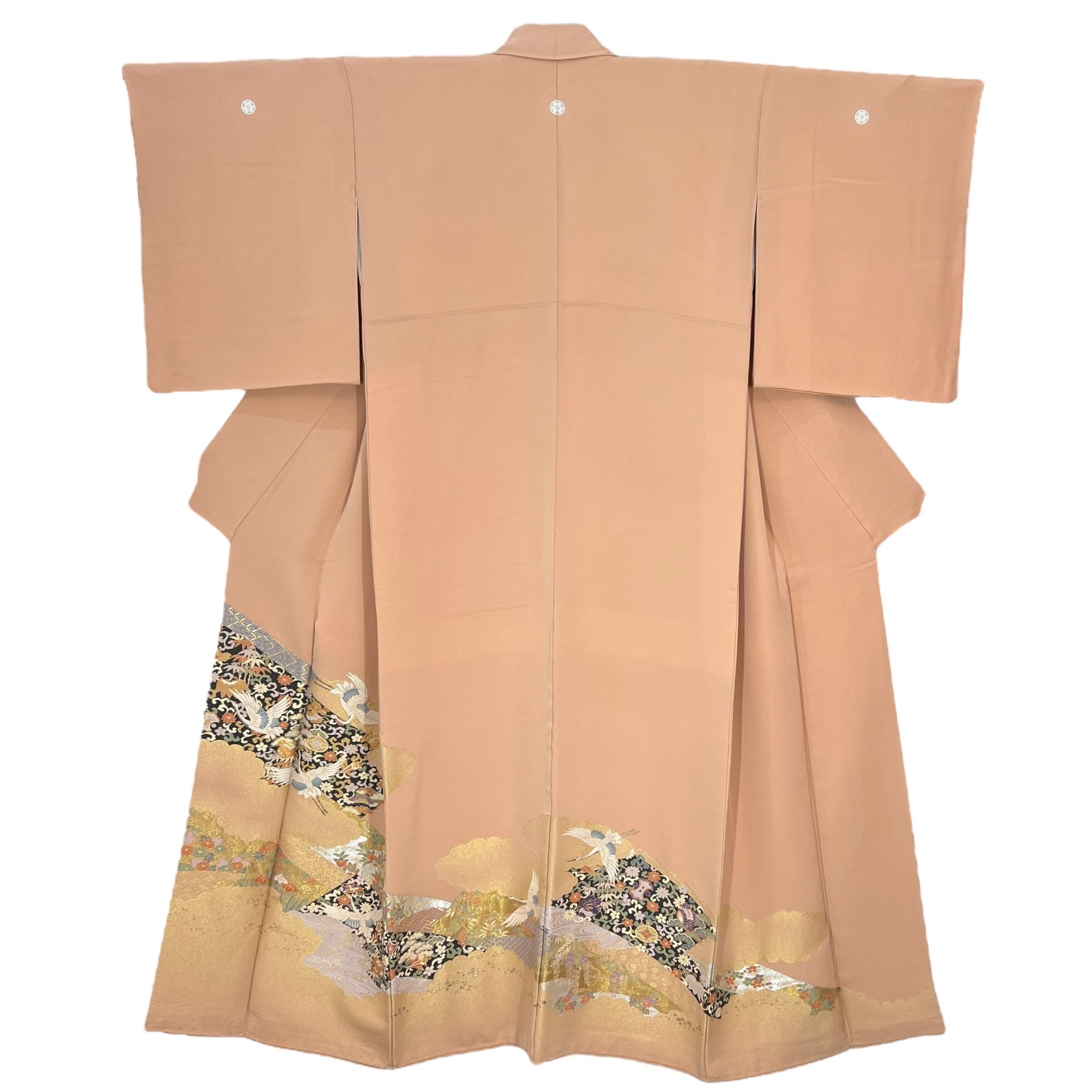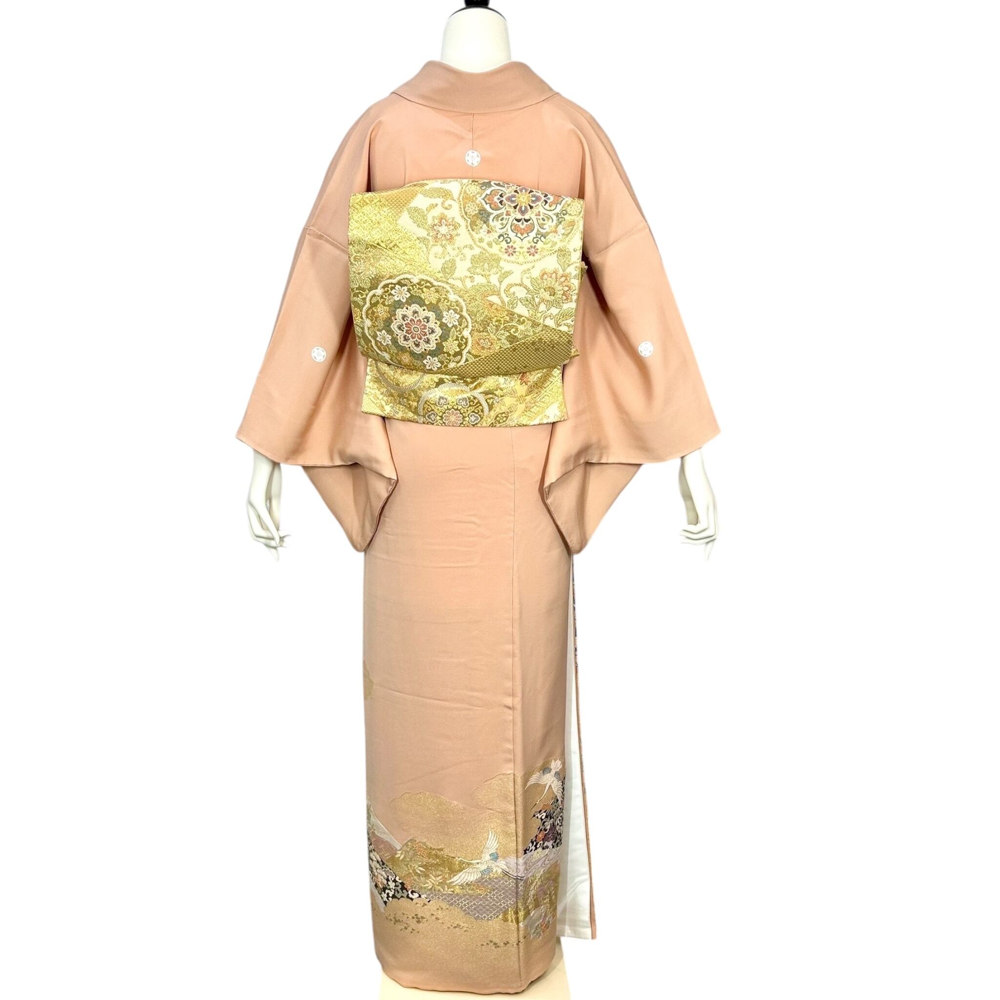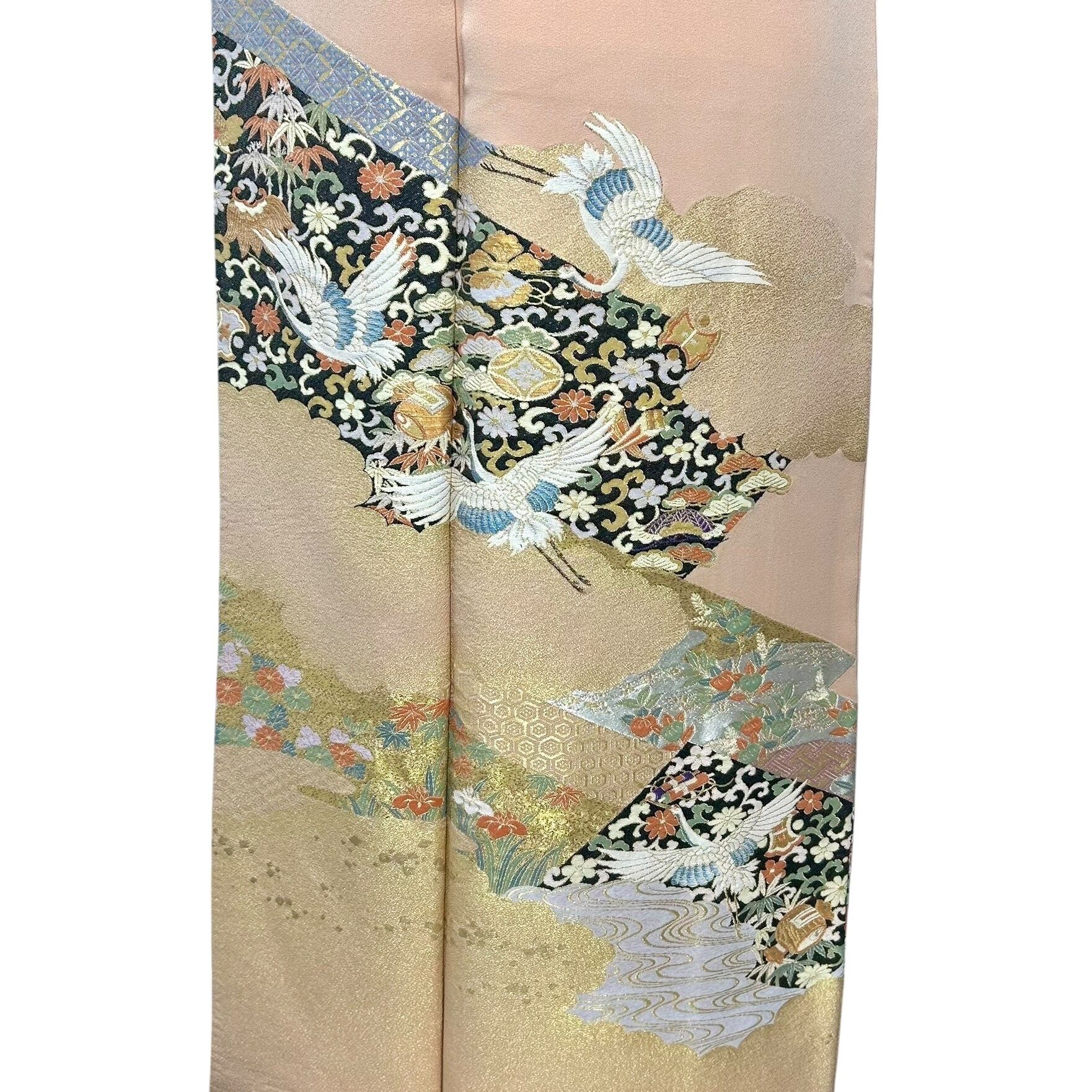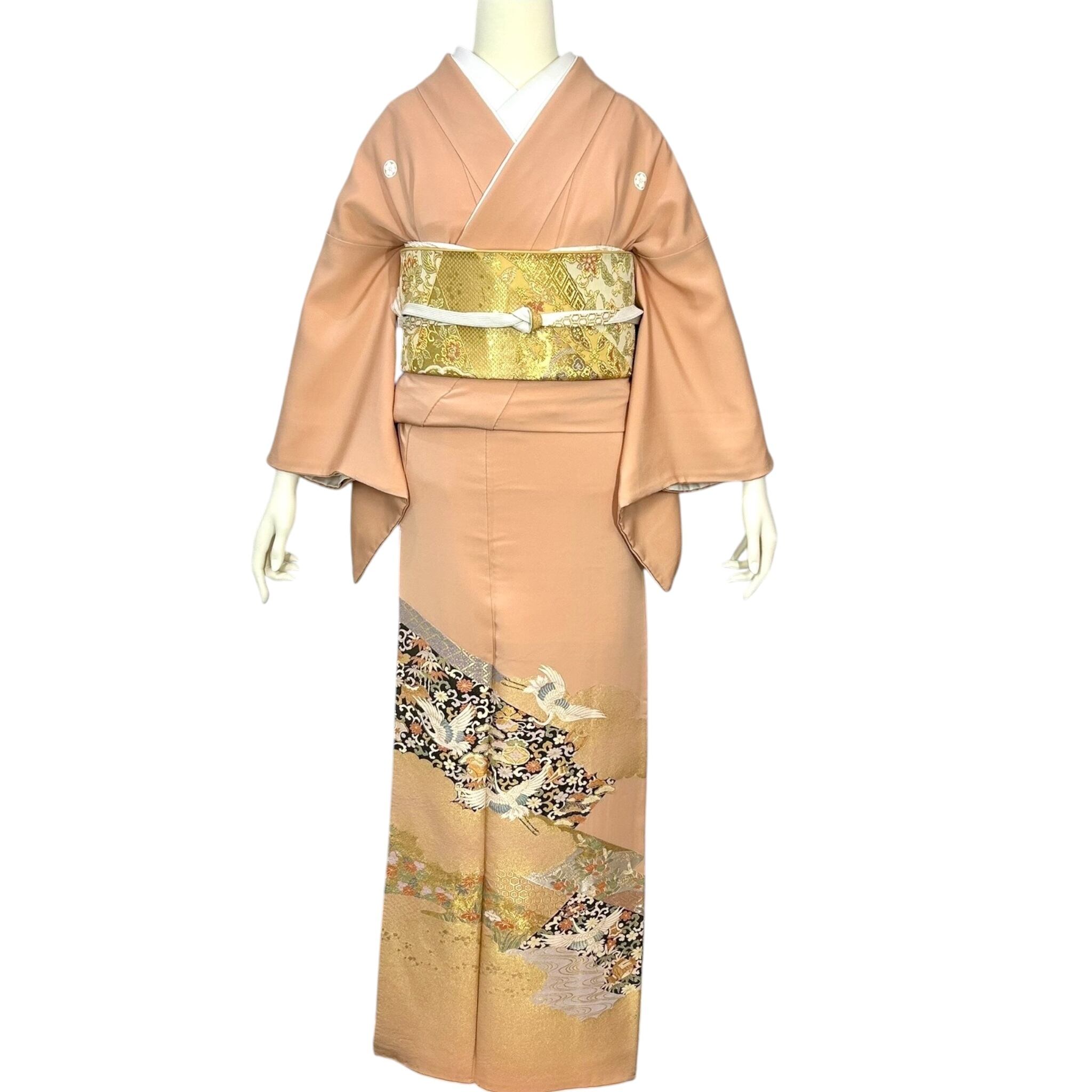 光沢のある上品な地色に飛翔鶴や宝尽くし、流水、亀甲などの吉祥文様が華やかな色留袖です。