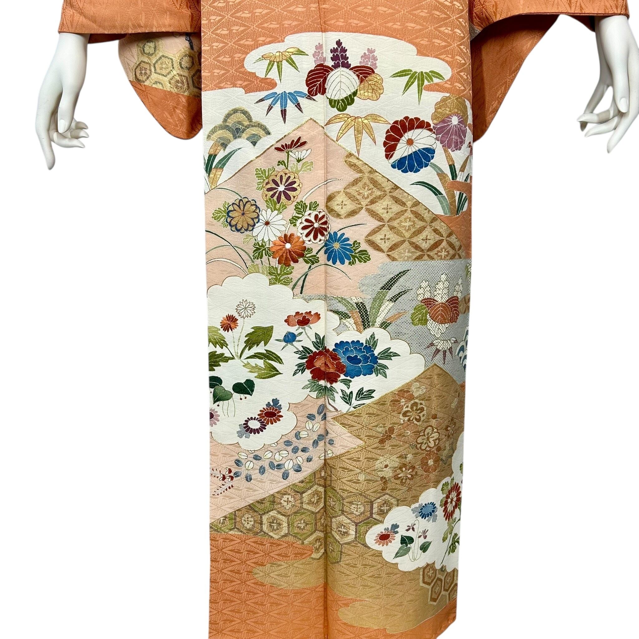 雲取り文様に七宝や青海波、亀甲の吉祥文様や四季草花文様が描かれた優雅で上品な印象の訪問着です。