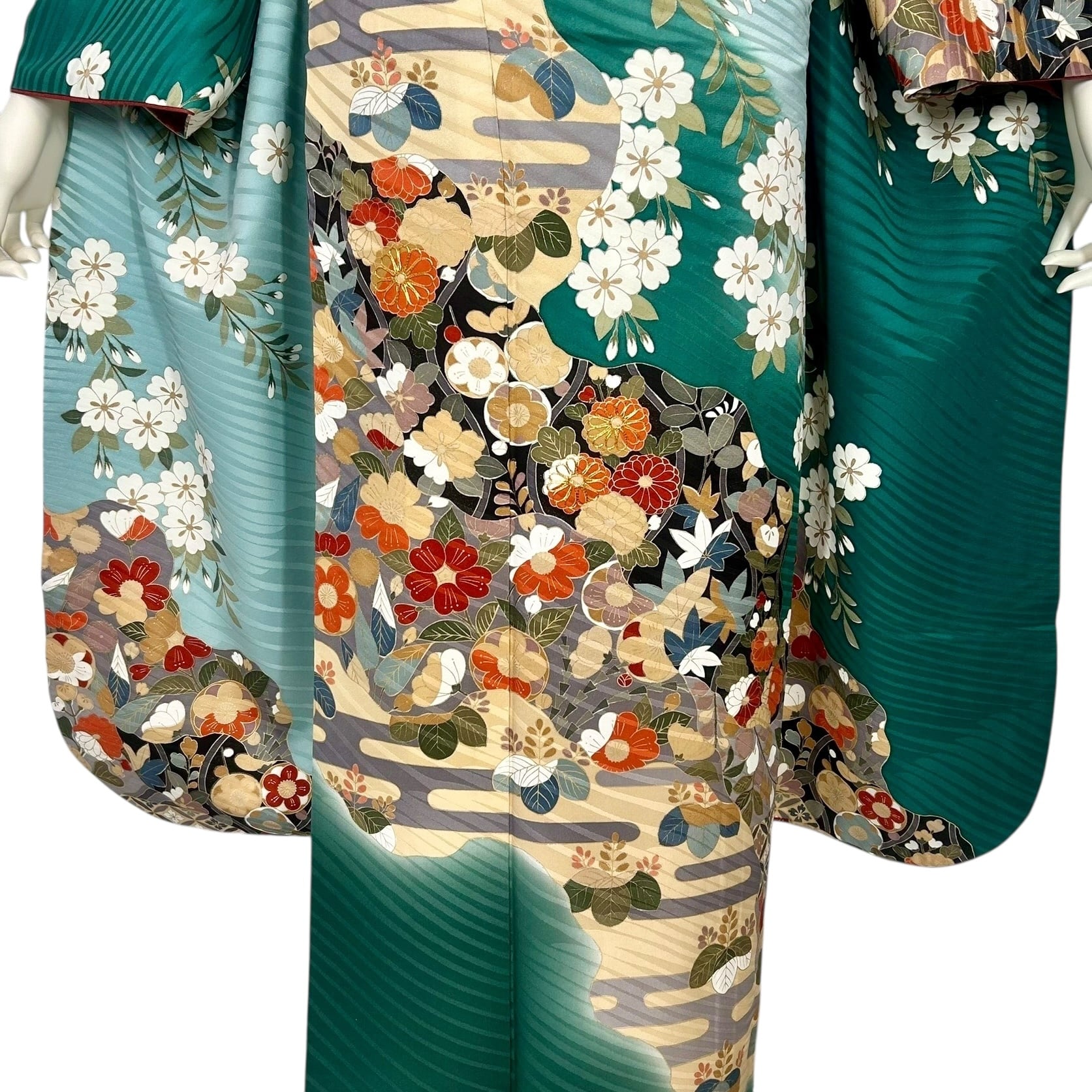 深い緑色の地色に霞の中に四季の花々や