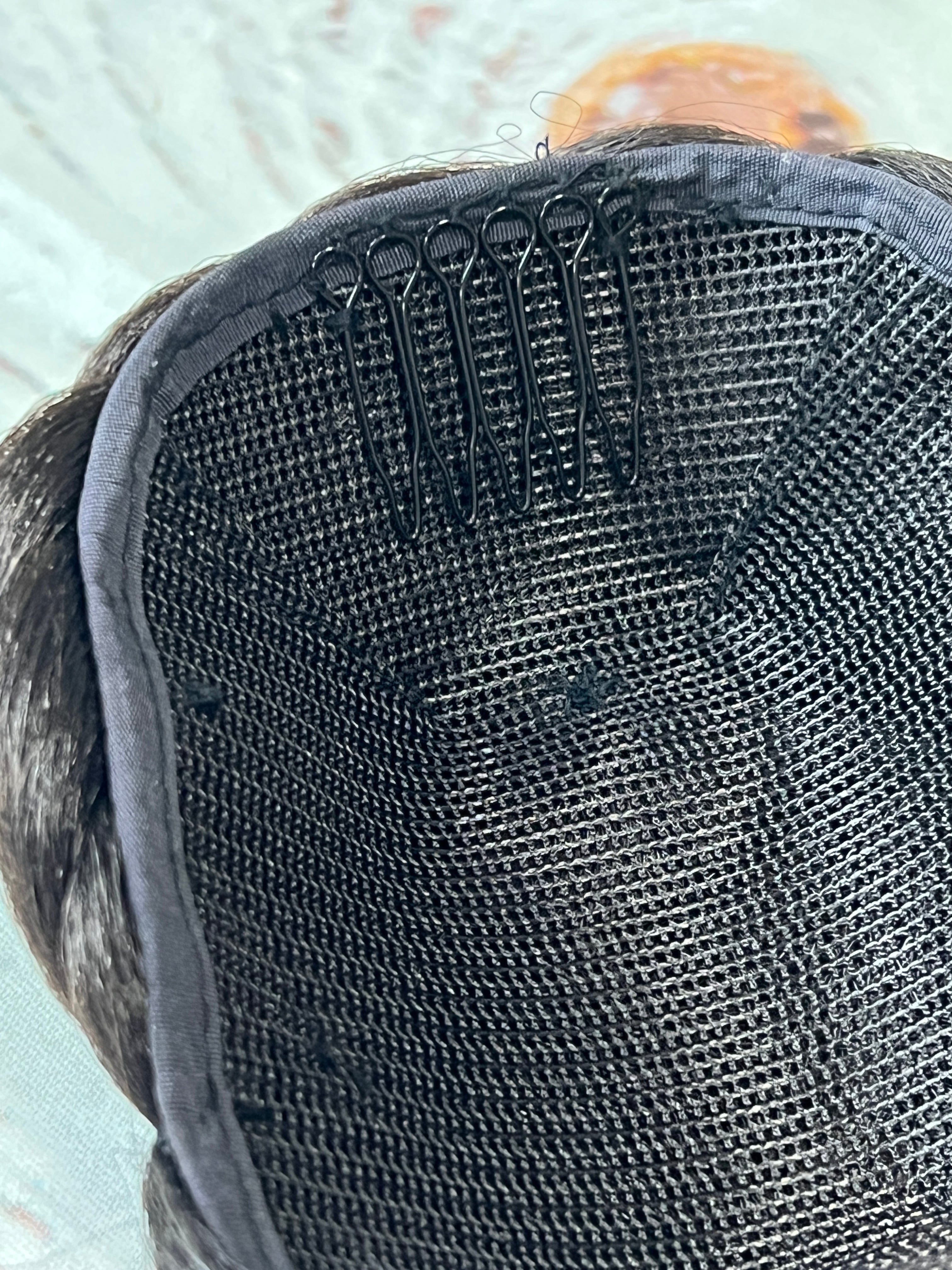 ②ウィッグの裏側のコームを地毛のお団子の付け根部分に差込んでかぶせます。