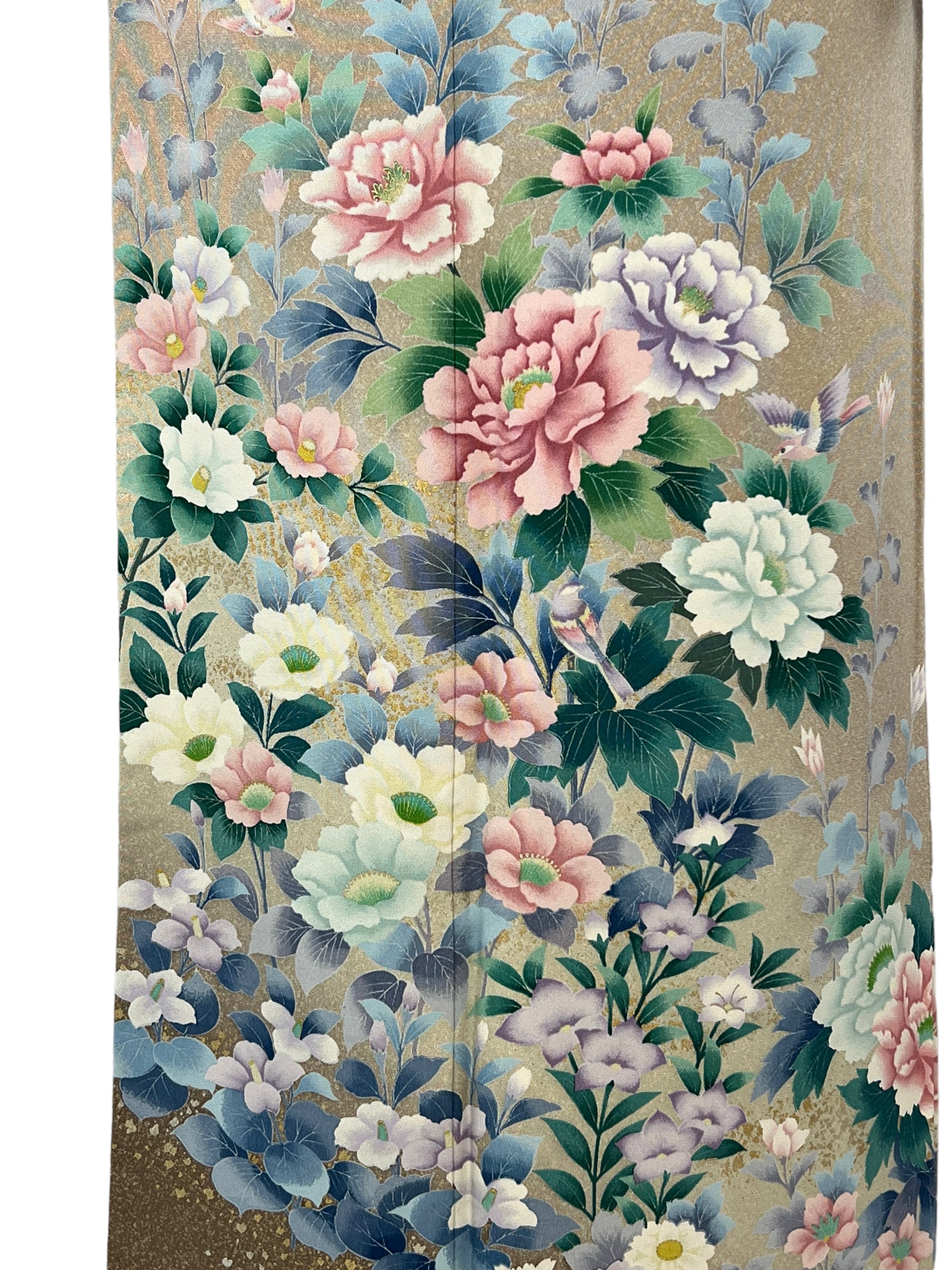 上品なベージュの地色に大輪の牡丹や四季草花に小鳥が舞う華やかな訪問着