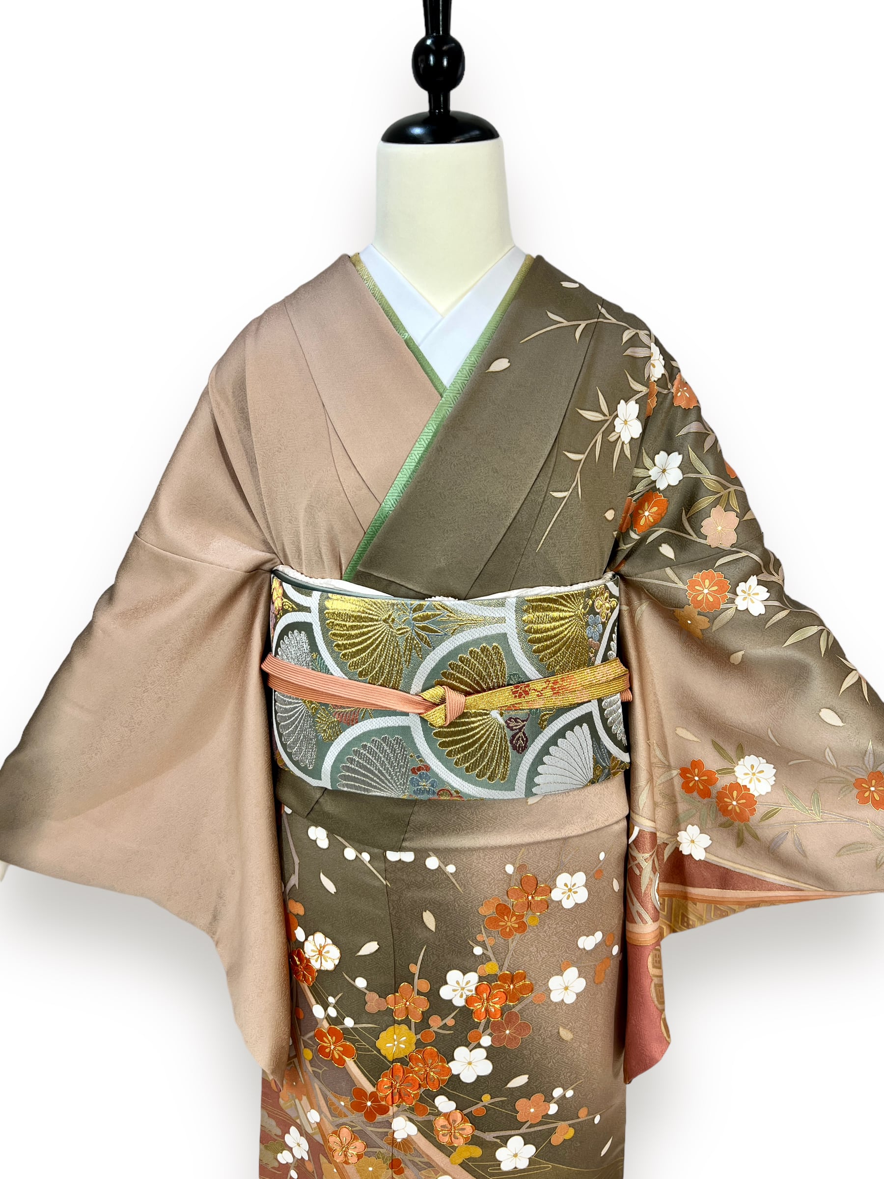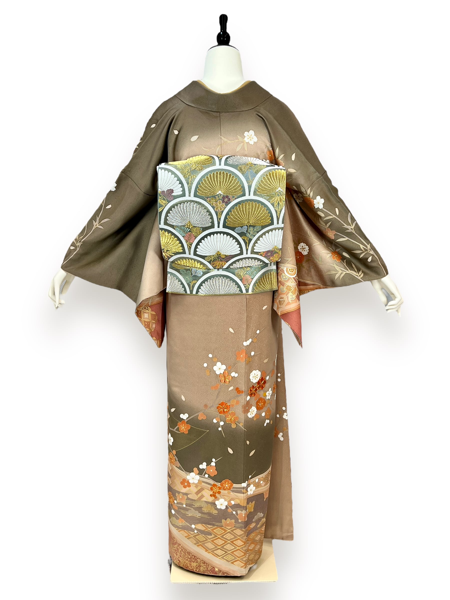 赤みのあるブラウンの切り替えが華やかな地色に吉祥文様が描かれた熨斗文様を配した訪問着