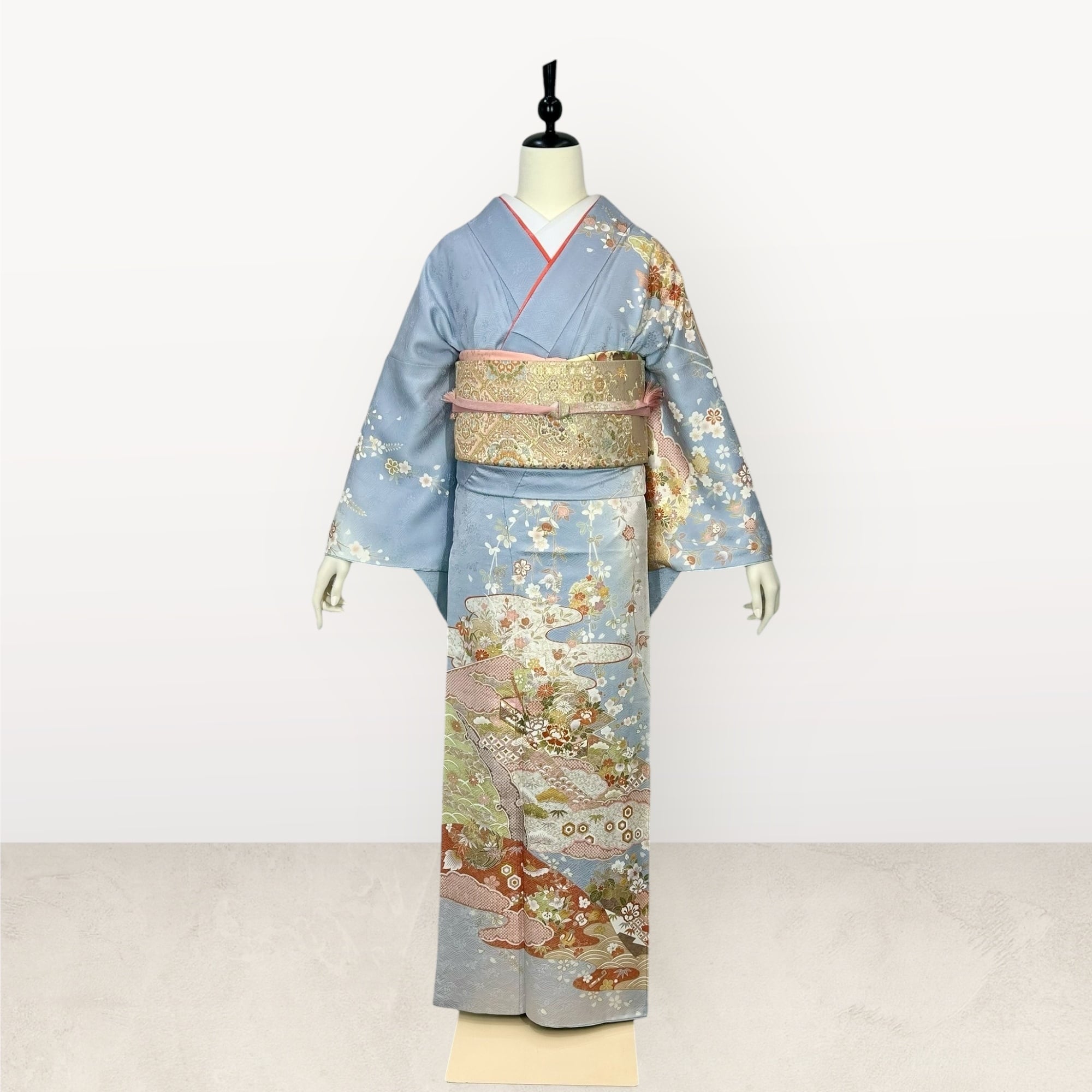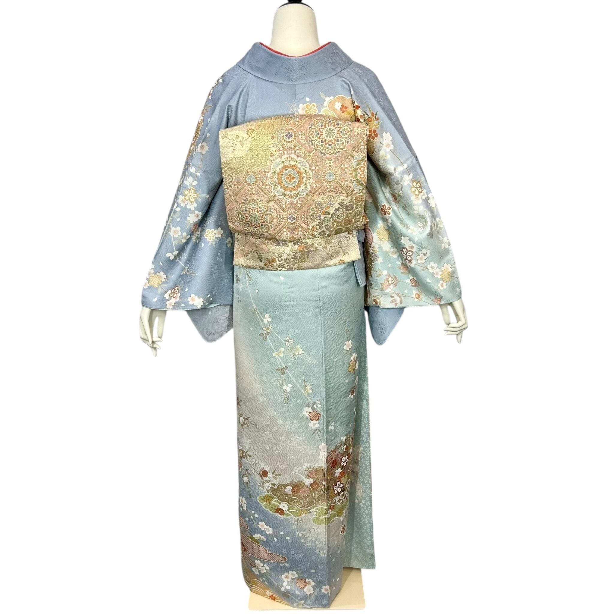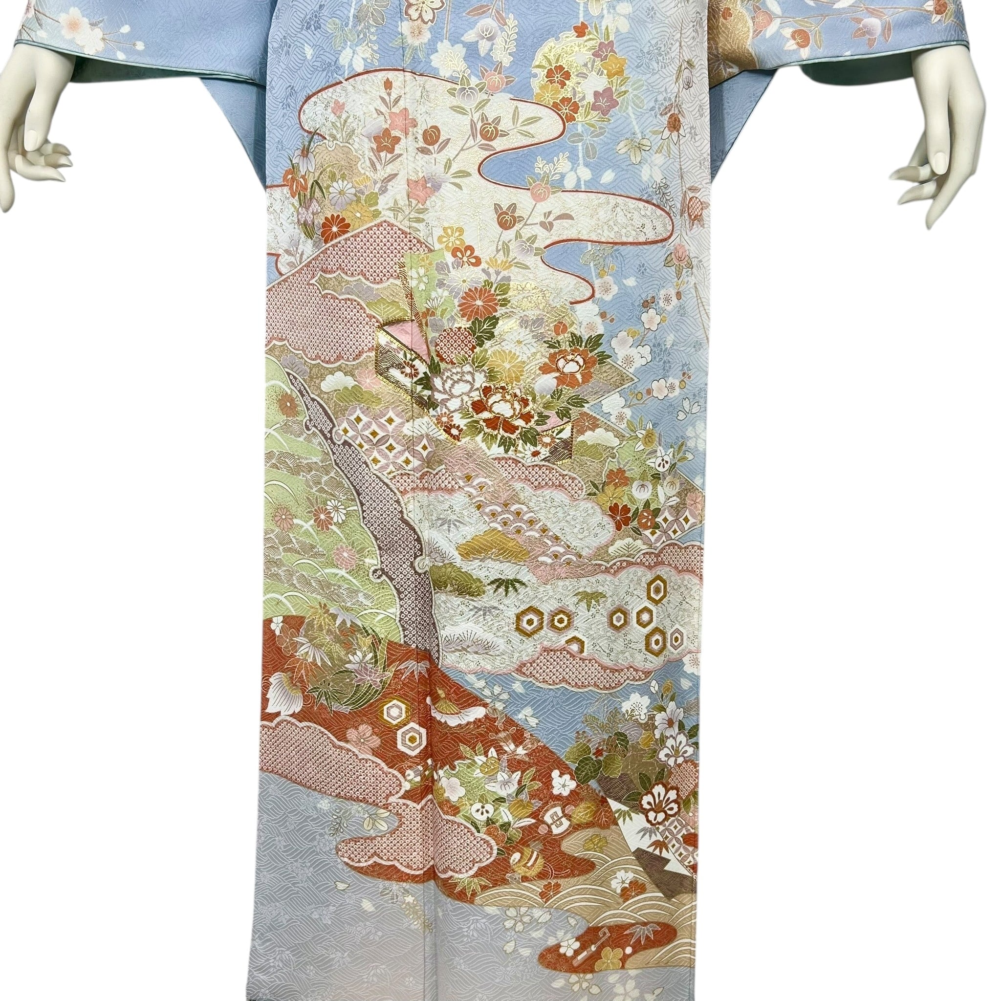 爽やかな空色の地色に吉祥文様や四季の花々を配した華やかな訪問着
